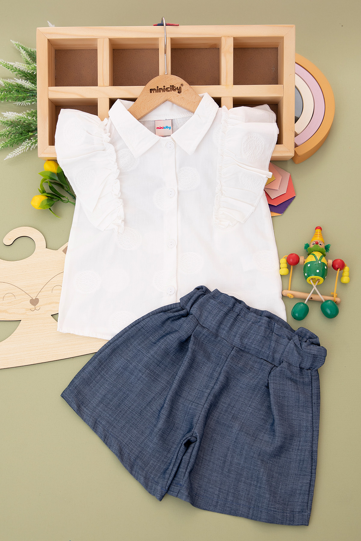 Kız Çocuk Fırfırlı Gömlek Jakar Şortlu Takım - 24318 (11-14 Yaş)