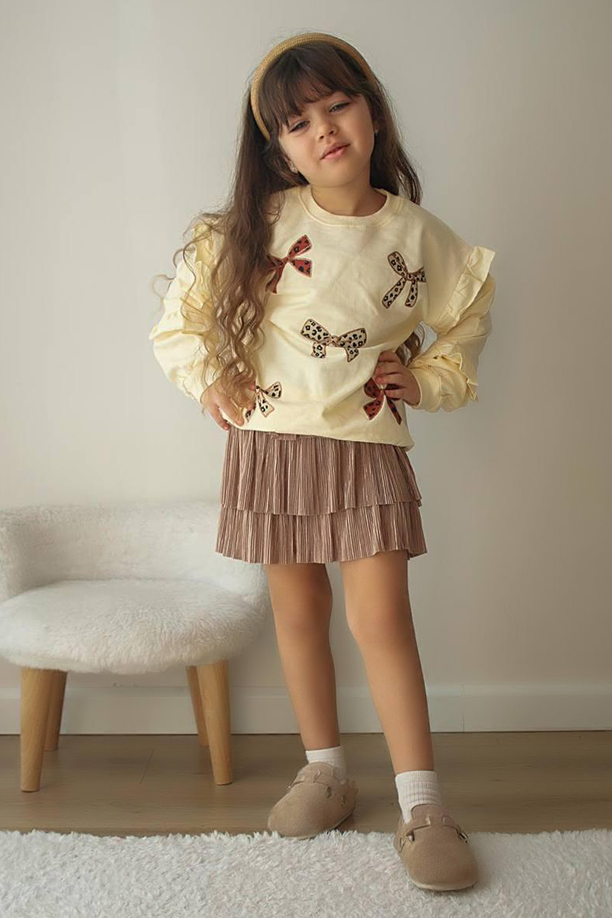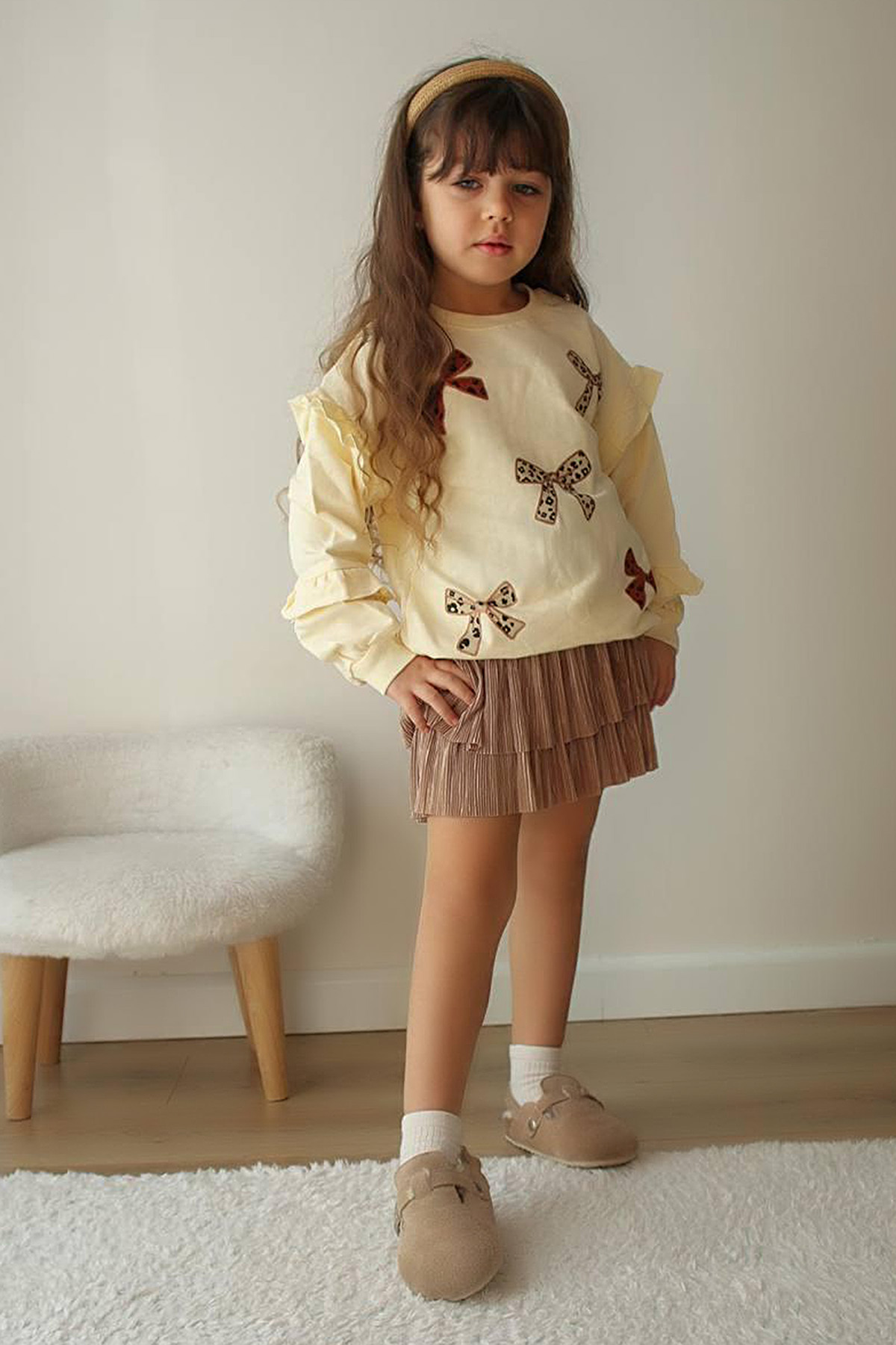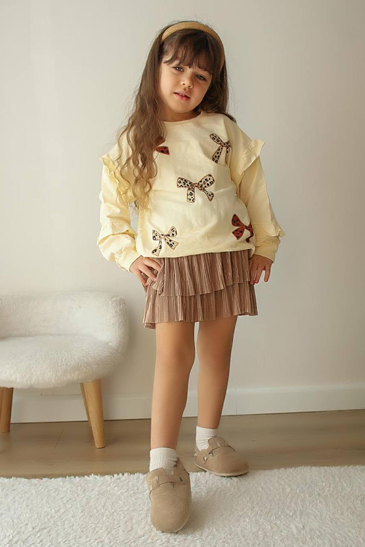 Kız Çocuk Fiyonk Nakışlı Pileli Etekli Takım - J-608 (3-10 Yaş)