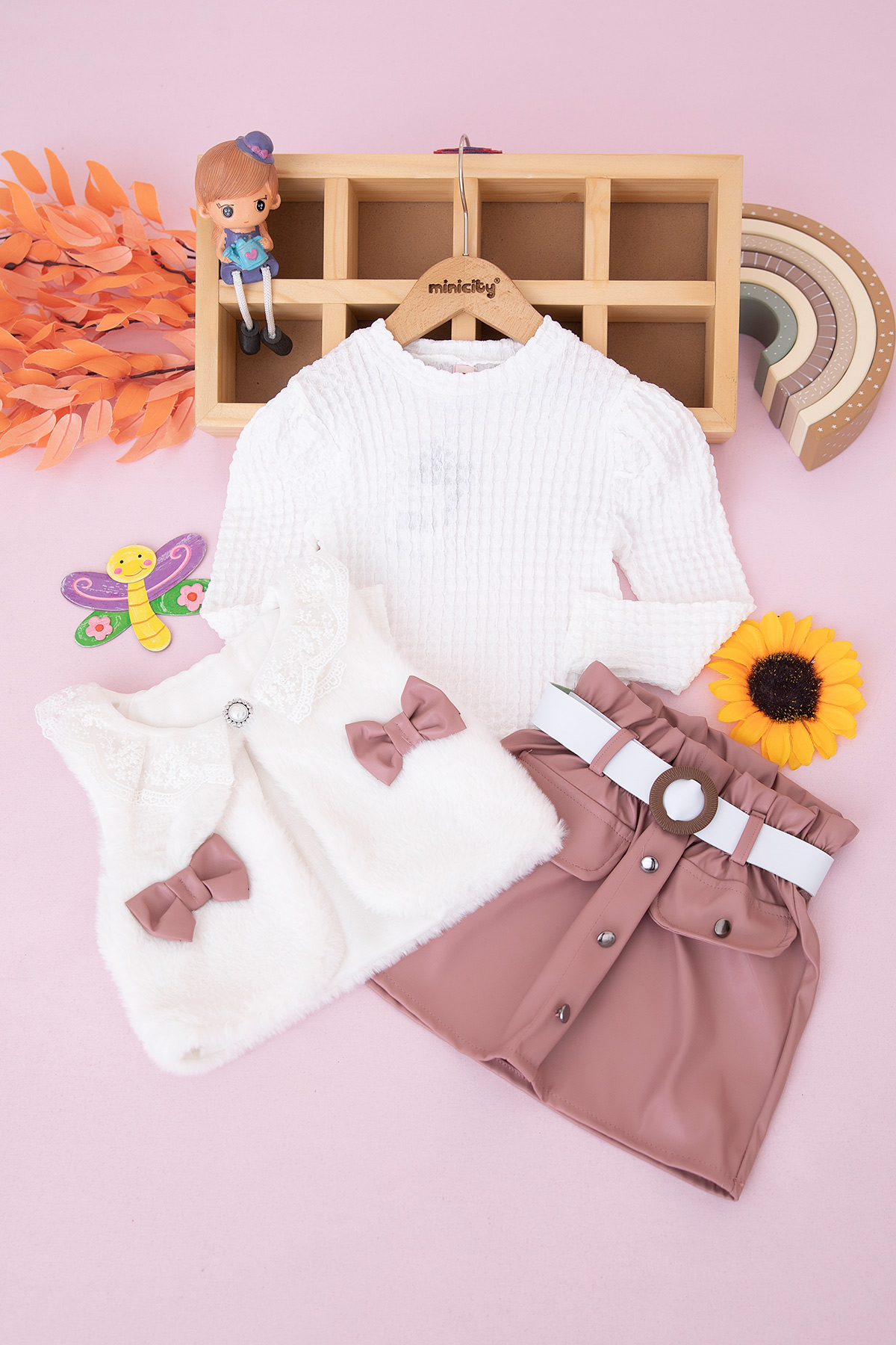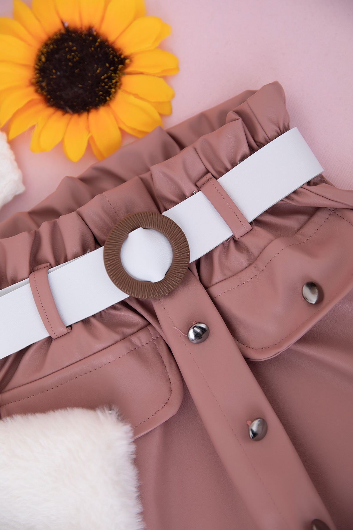 Kız Çocuk Fiyonklu Deri Etekli Takım - 25074 (2-5 Yaş)