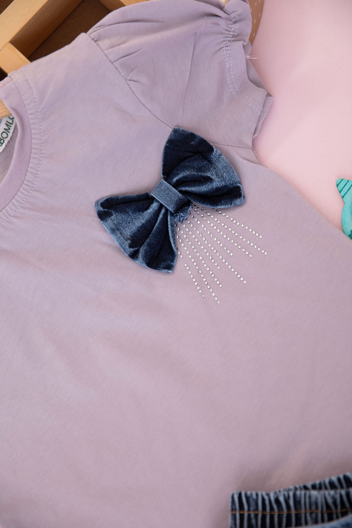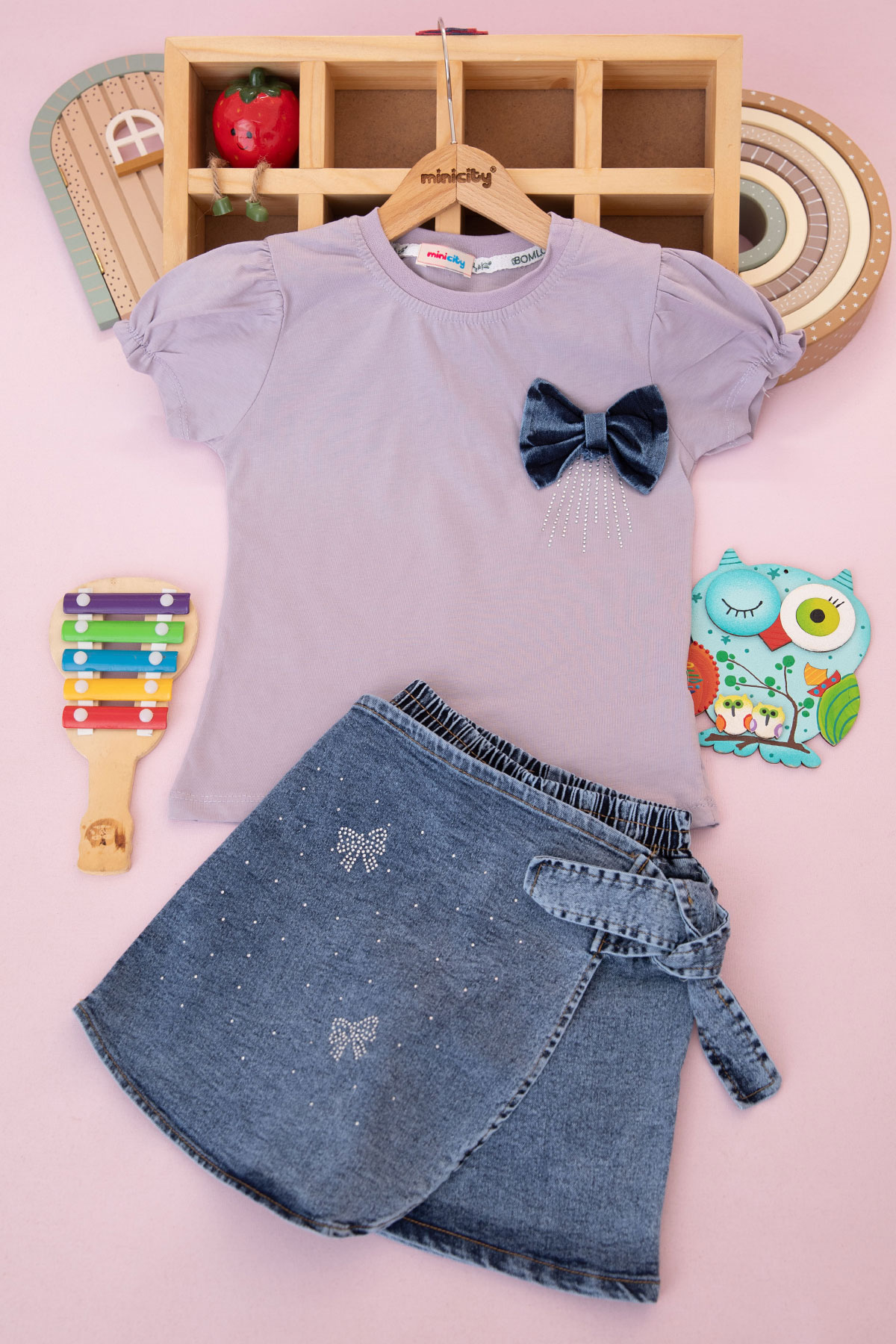 Kız Çocuk Fiyonklu Taş Baskılı Şortlu Takım - 90088 (5-8 Yaş)
