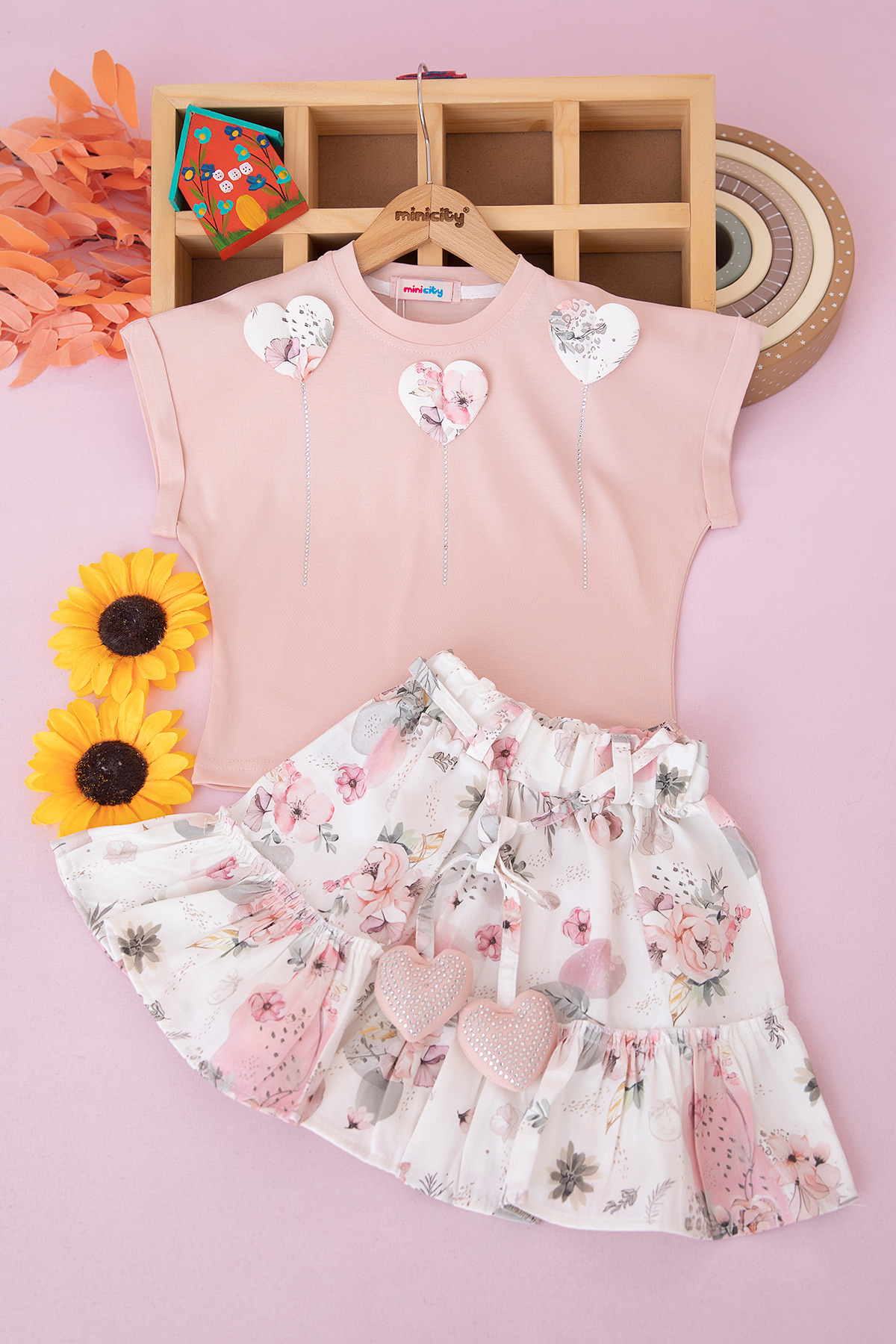 Kız Çocuk Gabardin Kalpli Etekli Takım - 2072 (4-10 Yaş)