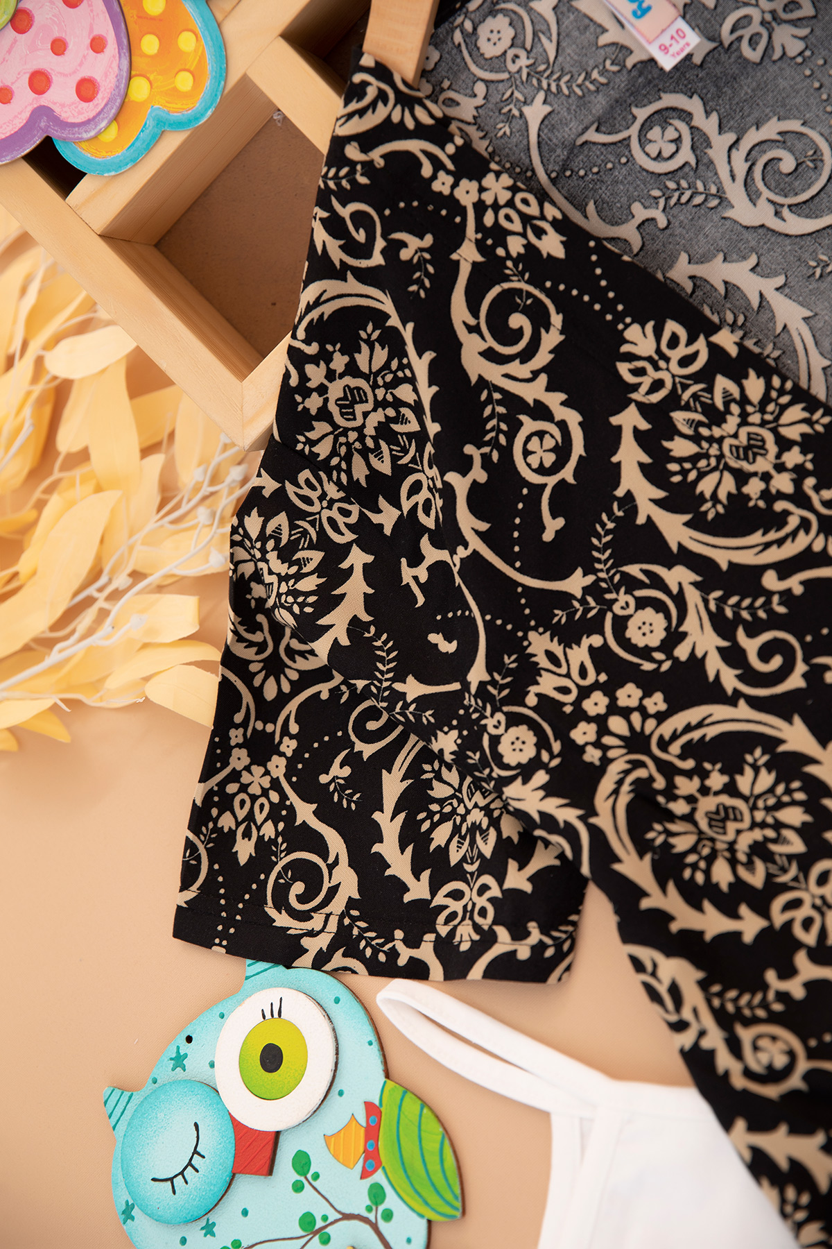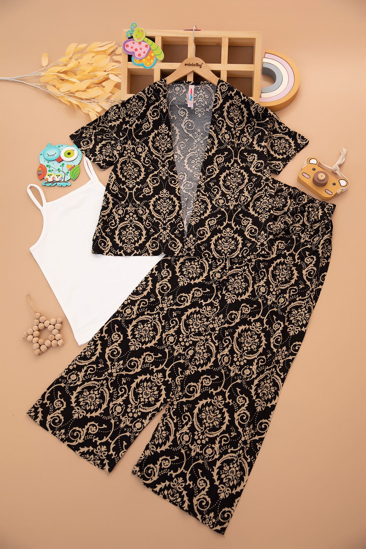 Kız Çocuk Garson Kimonolu Baskılı Üçlü Takım - (8-13 Yaş)