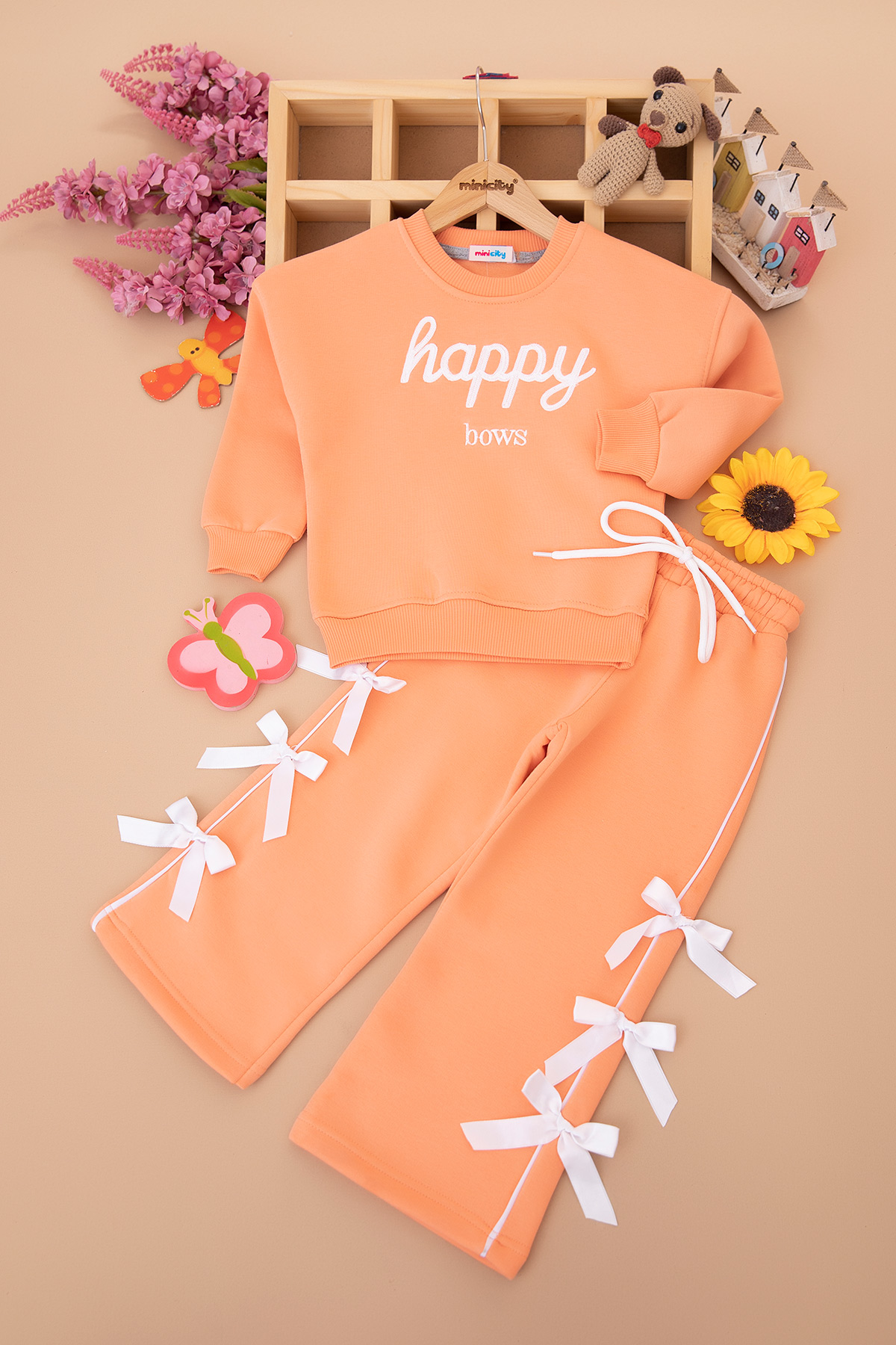 Kız Çocuk Happy Nakışlı Fiyonklu Üçip Takım - 5040 (3-10 Yaş)