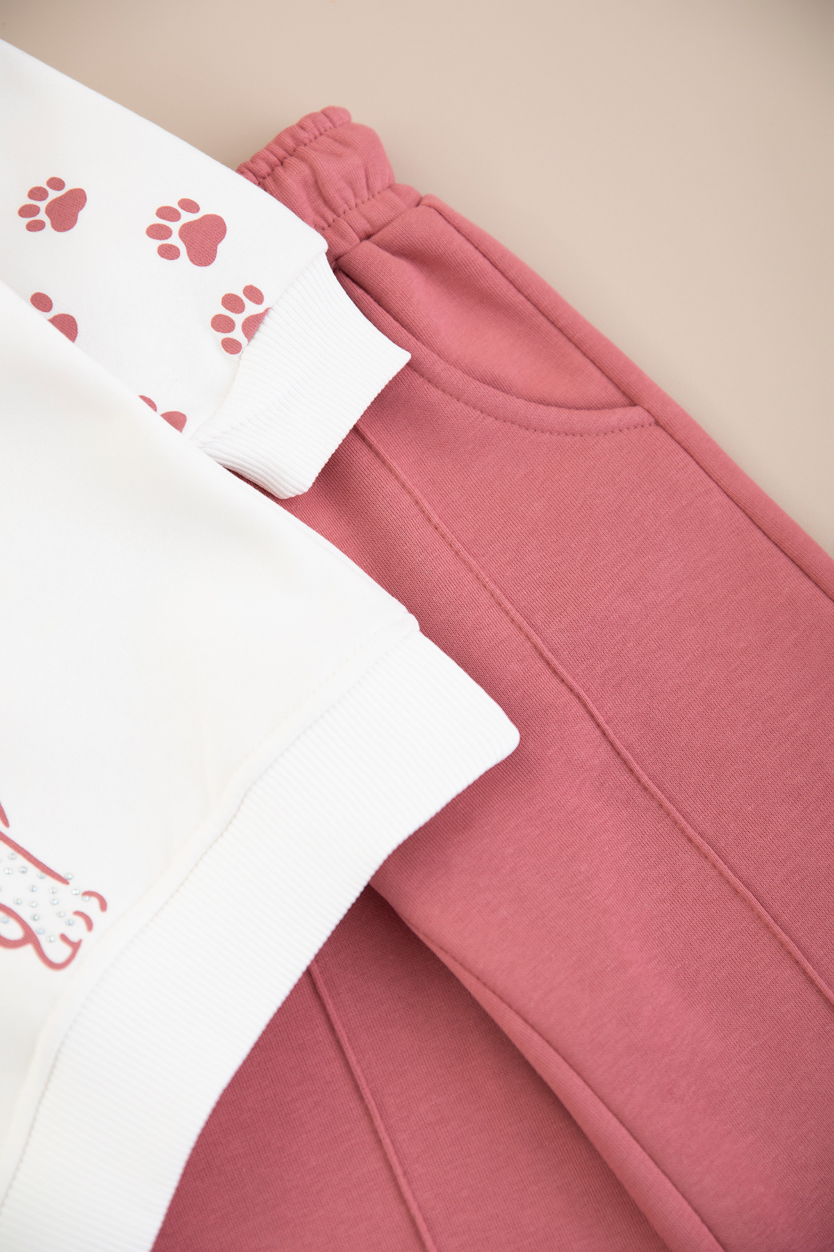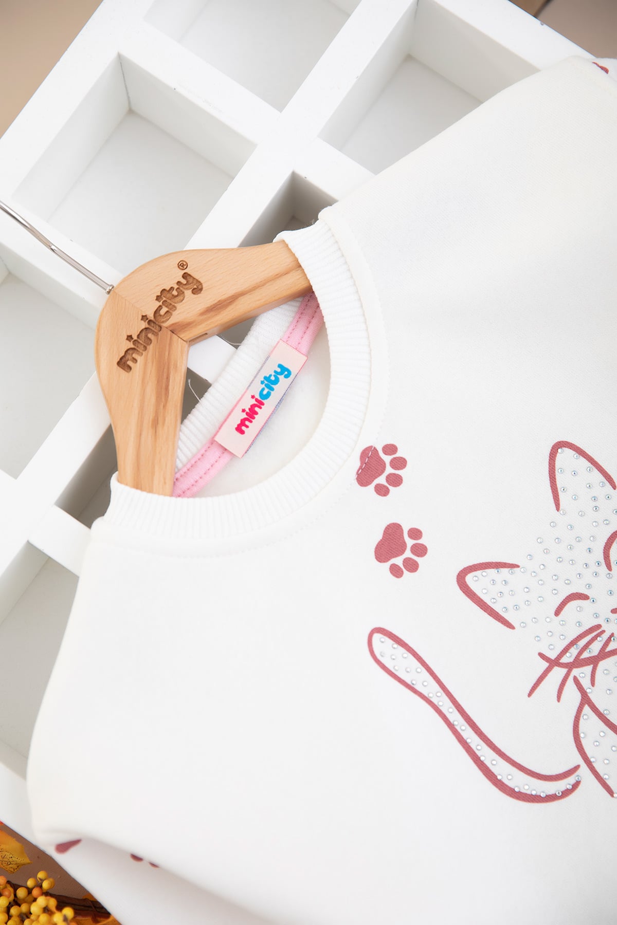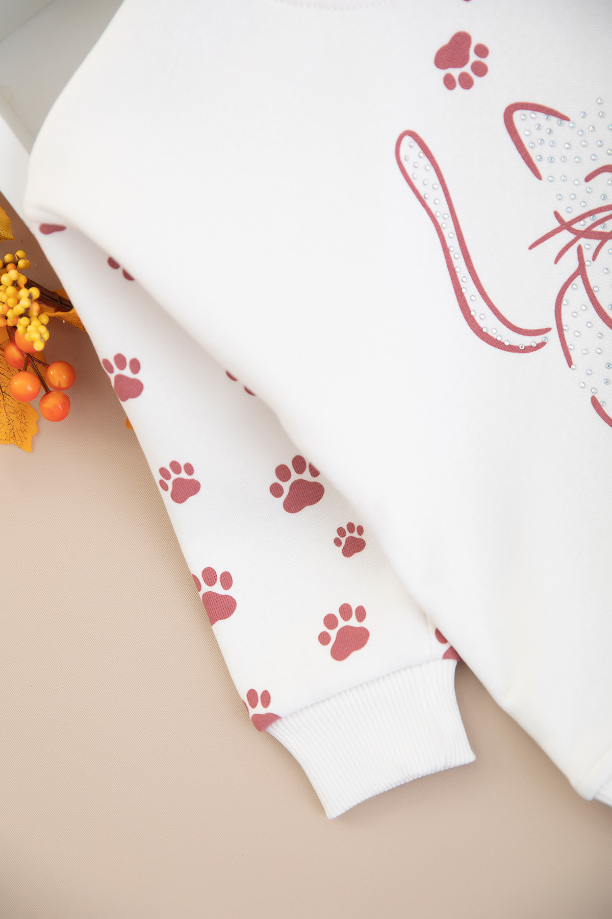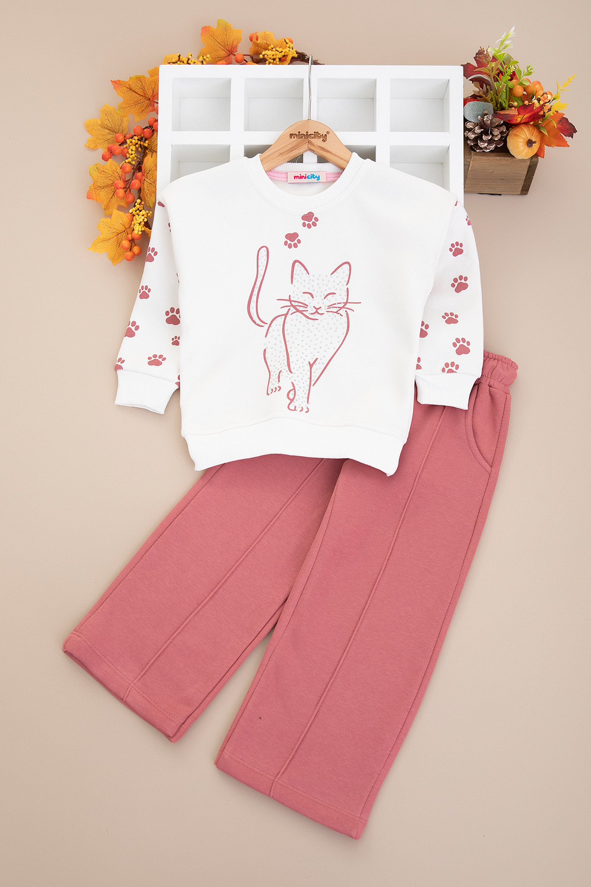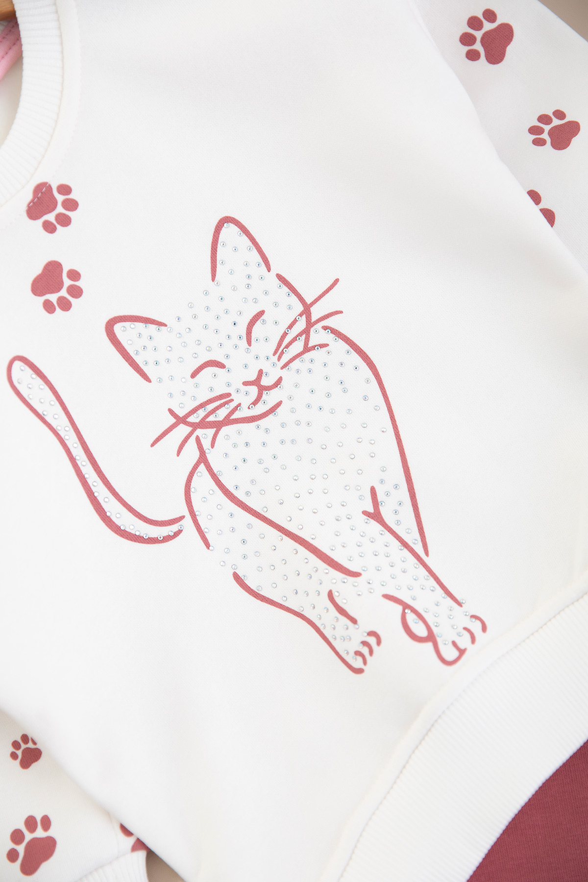 Kız Çocuk Kedi Baskılı Taşlı Üçip Takım - 5058 (3-10 Yaş)