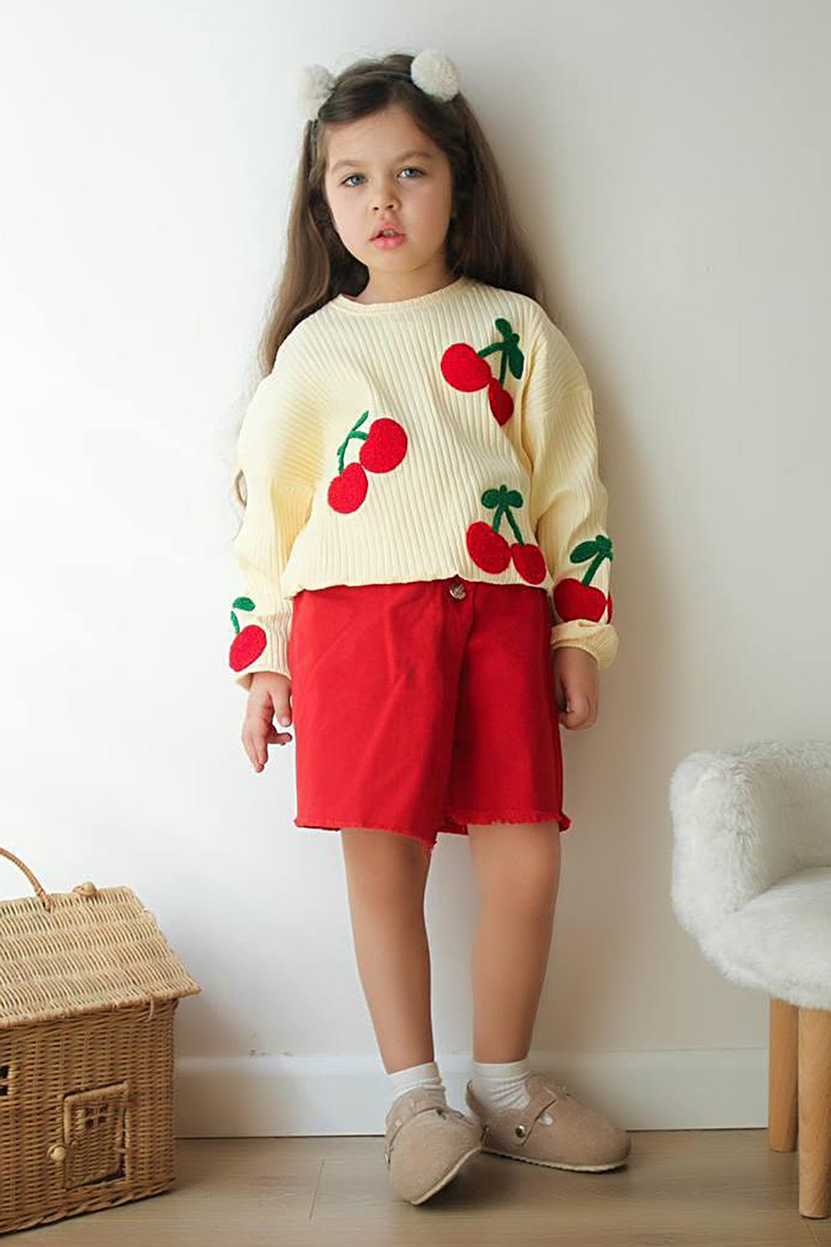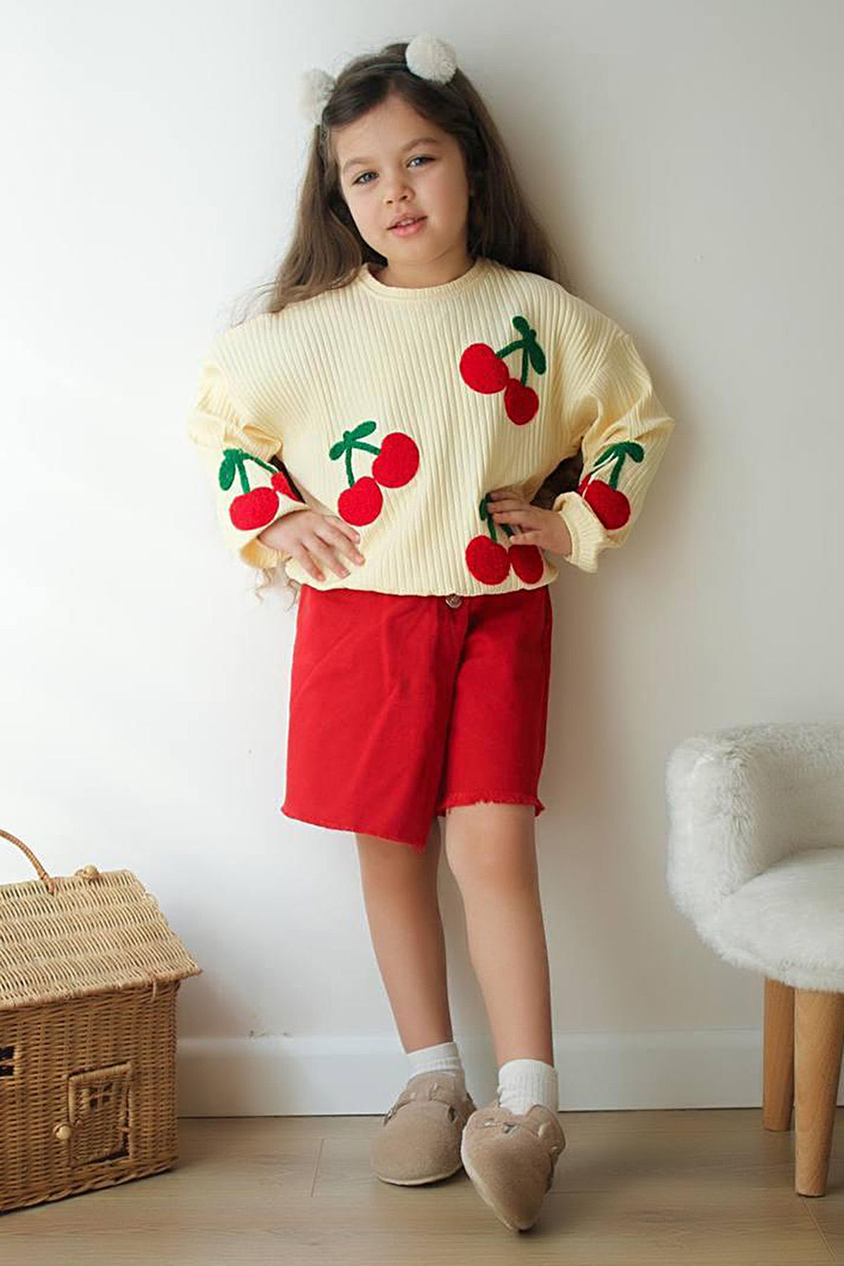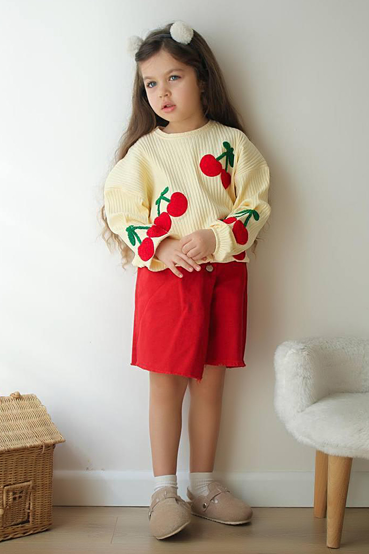 Kız Çocuk Kiraz Nakışlı Kot Şort Etek Takım - K-5961 (3-10 Yaş)