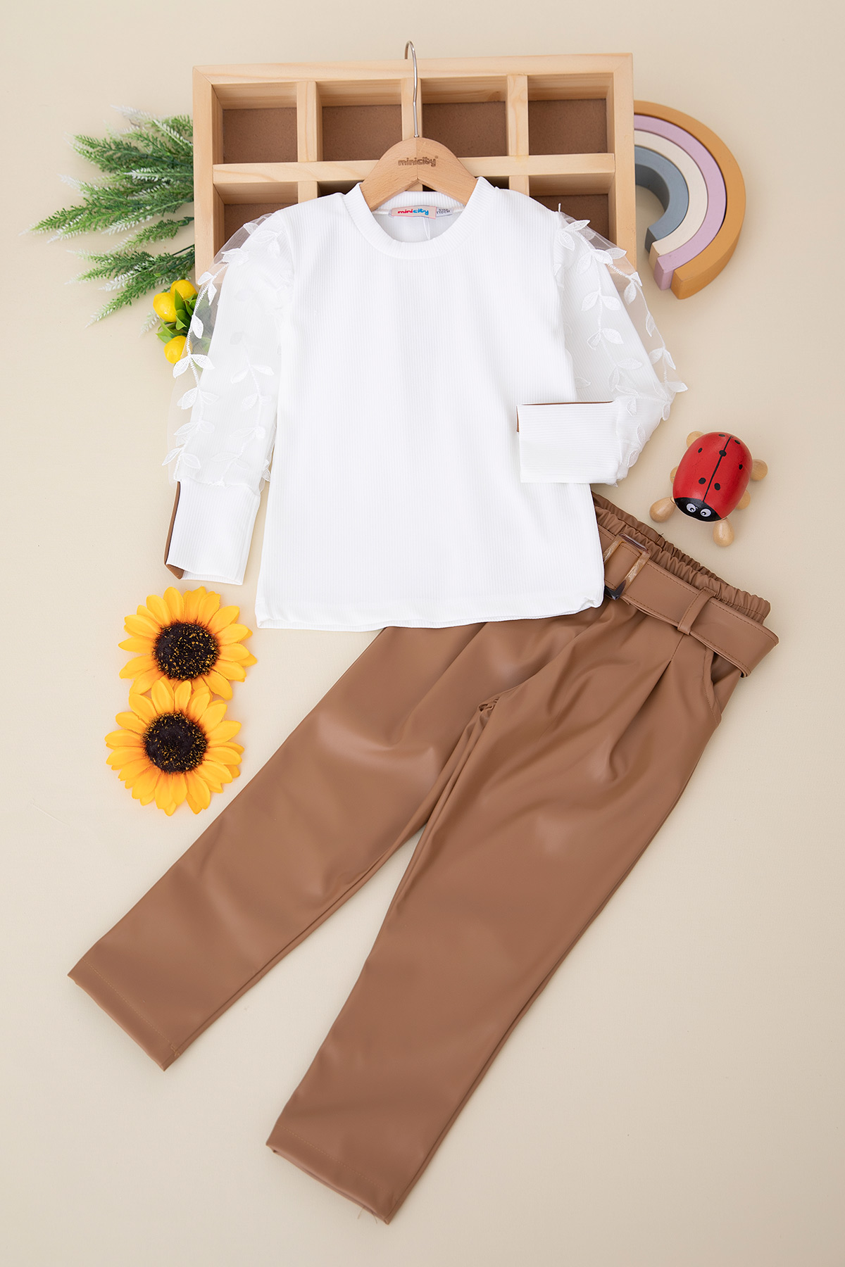 Kız Çocuk Kolları Dantel Deri Pantolon Takım - 6305 (5-8 Yaş)