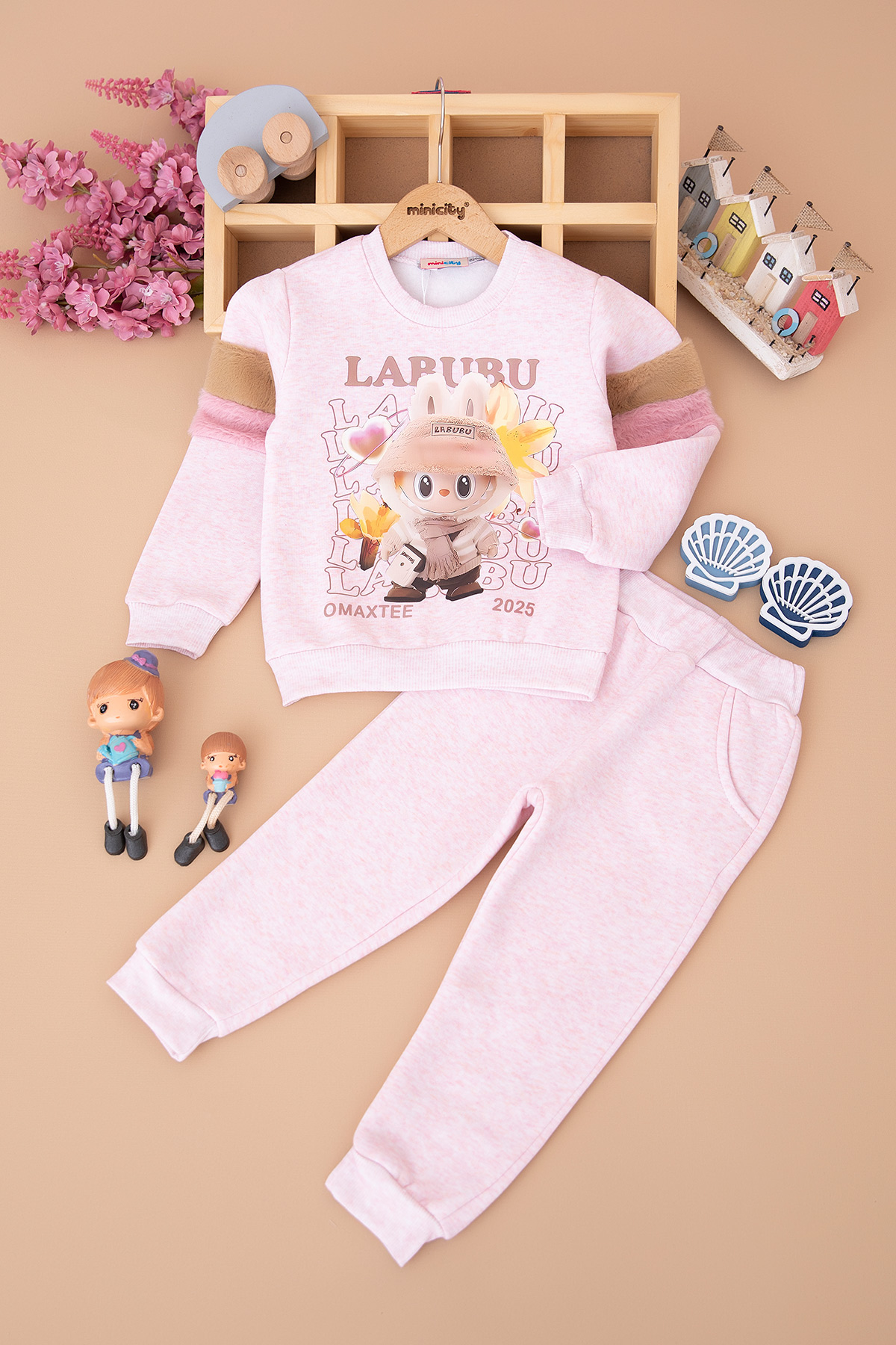 Kız Çocuk Kolları Pembe Peluş Üçip Takım - 263 (3-7 Yaş)