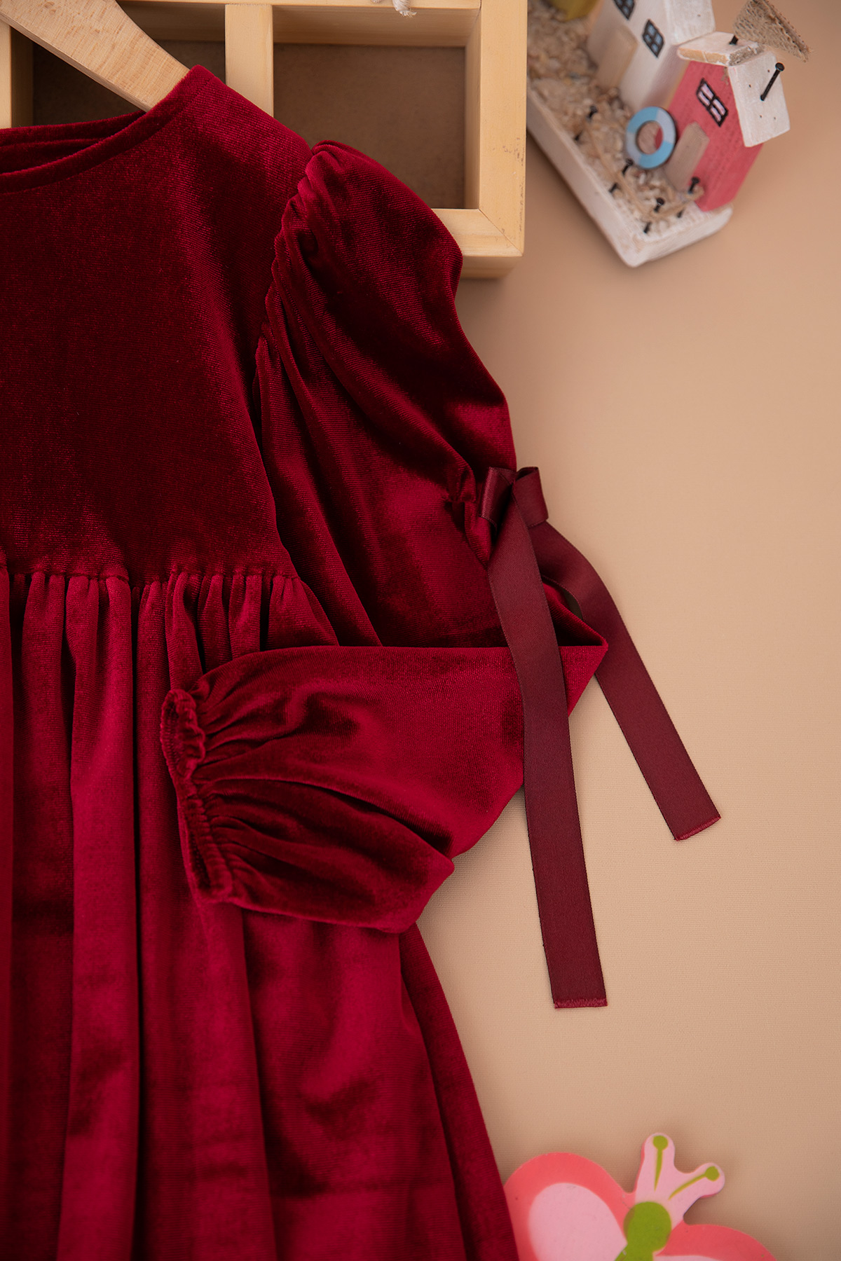 Kız Çocuk Kolu Kurdeleli Kadife Elbise - 1102 (2-7 Yaş)