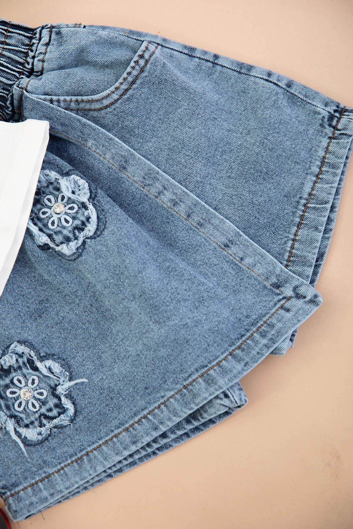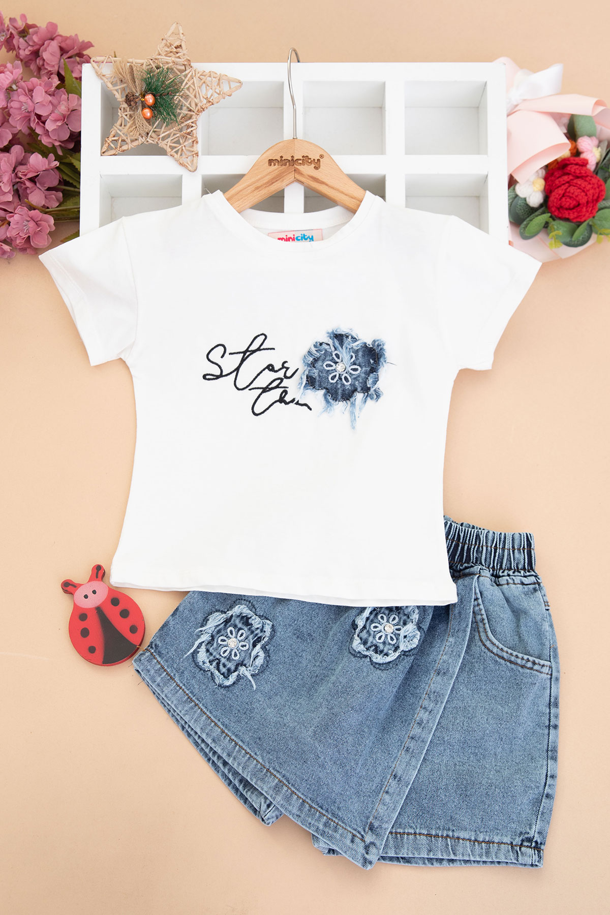 Kız Çocuk Kot Çiçekli Şort Etek Takım - 1706 (3-7 Yaş)