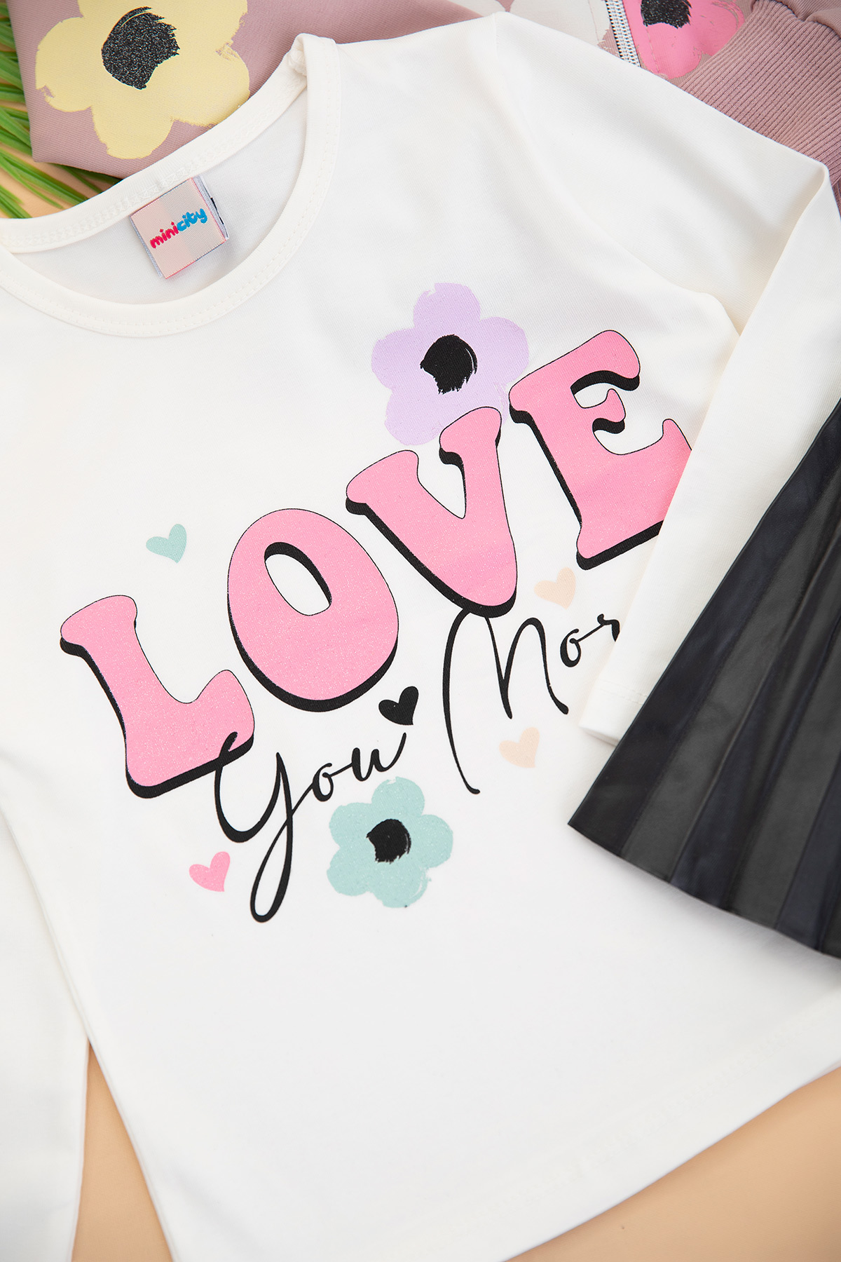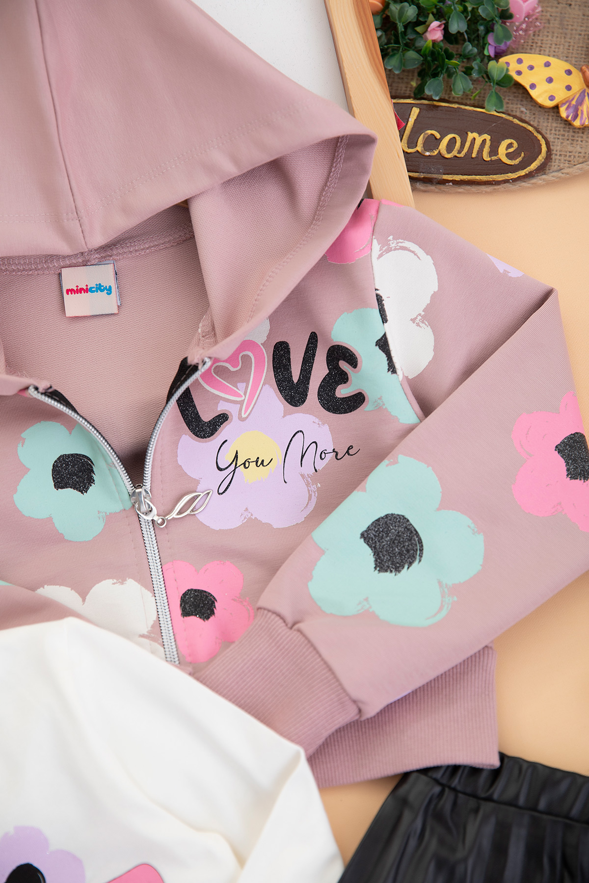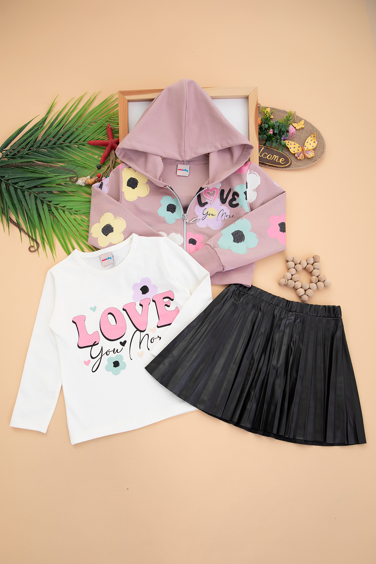 Kız Çocuk Love Çiçekli Baskılı Deri Etekli Takım - 6002 (3-10 Yaş)