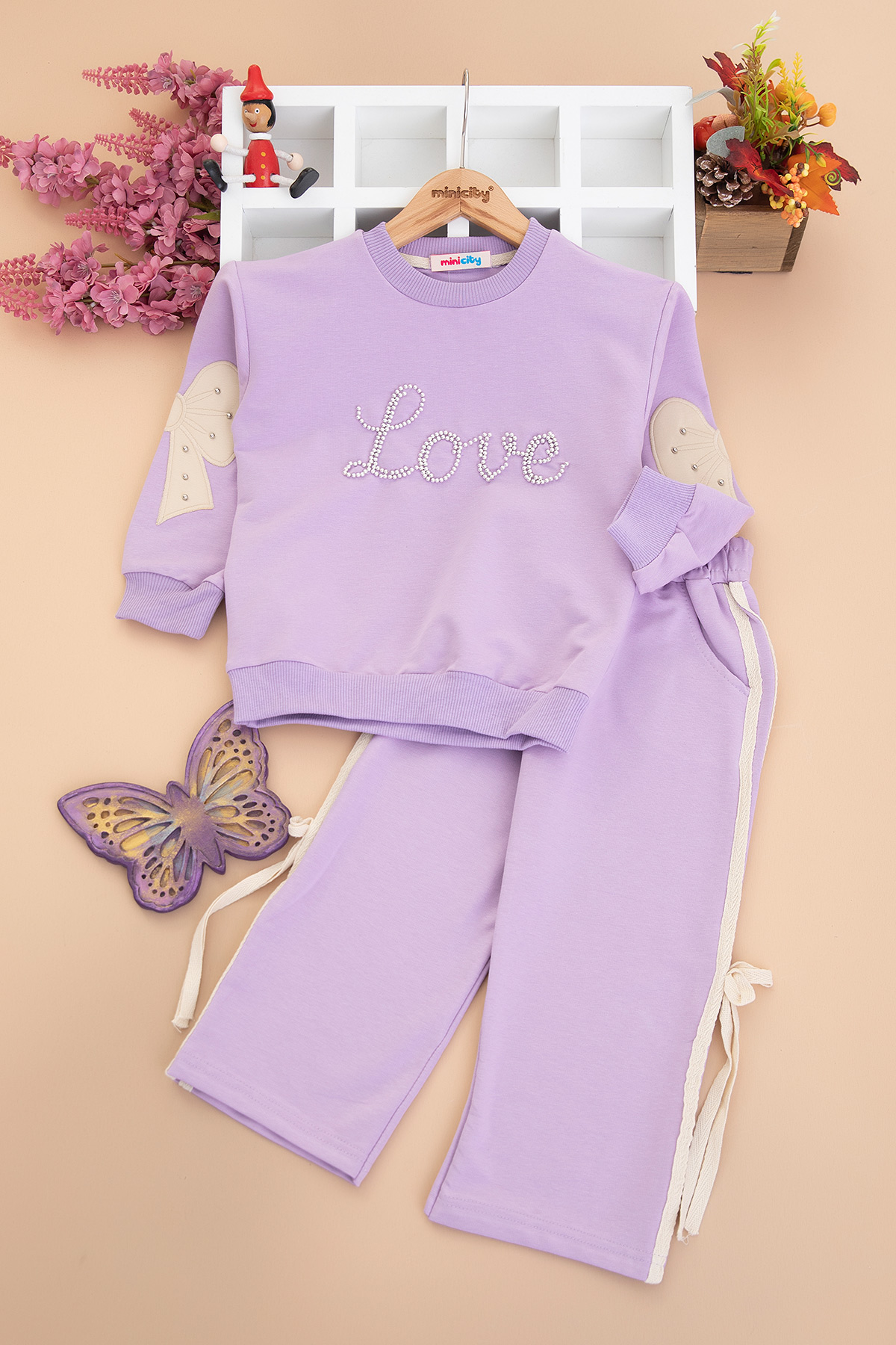 Kız Çocuk Love Taşlı Kolu Fiyonklu Takım (3-10 Yaş)