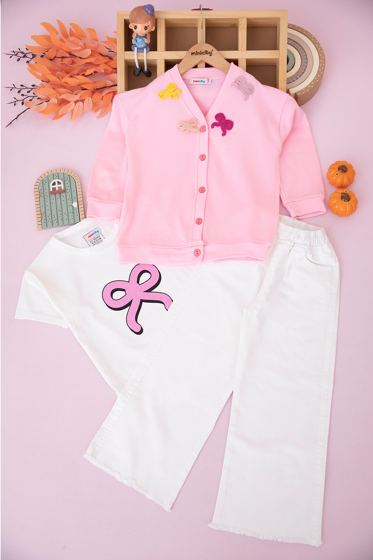 Kız Çocuk Örgü Fiyonklu Hırkalı Takım - 70665 (5-12 Yaş)