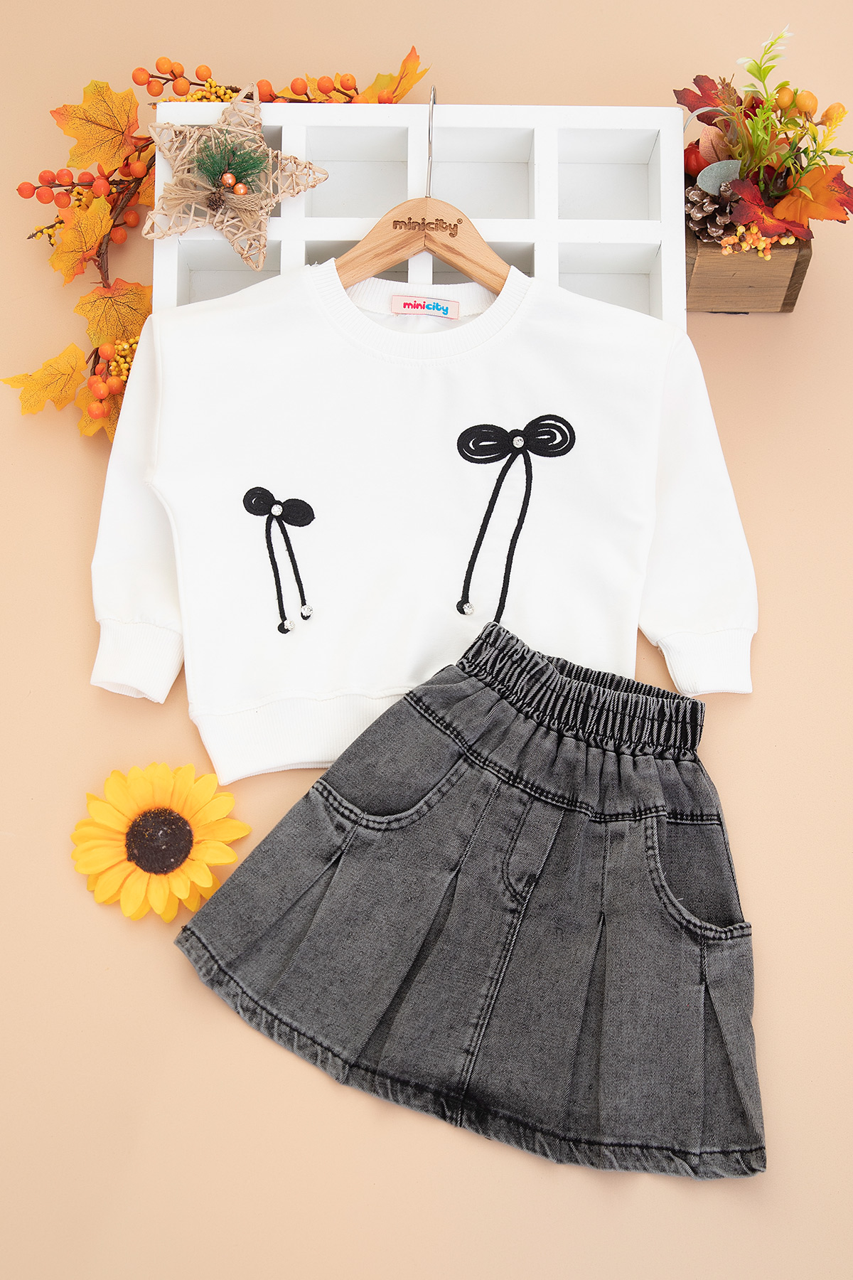 Kız Çocuk Örme Fiyonklu Kot Etek Takım - 2690 (3-7 Yaş)