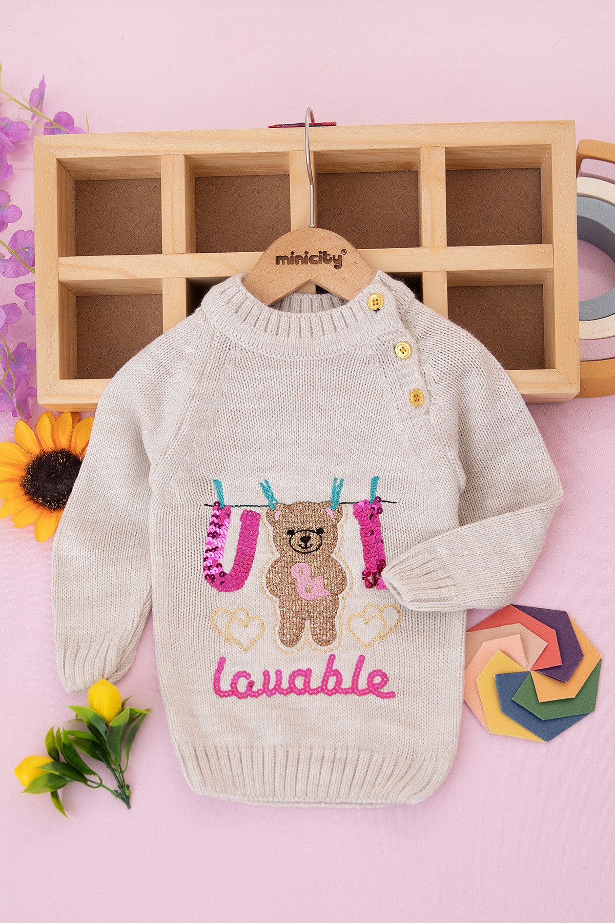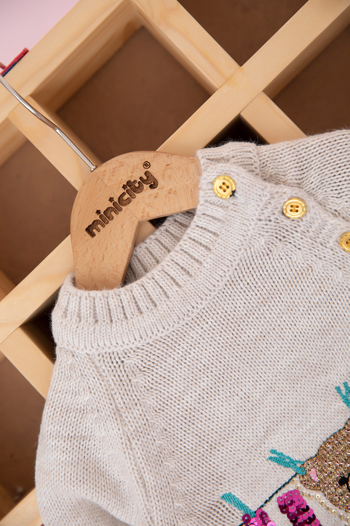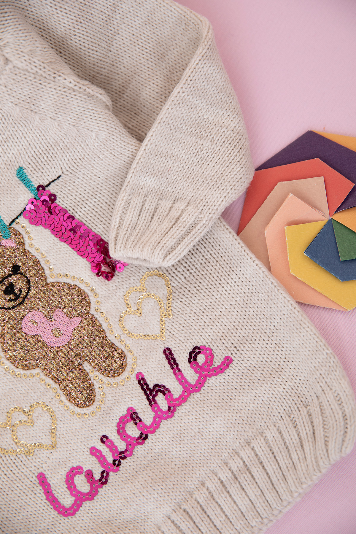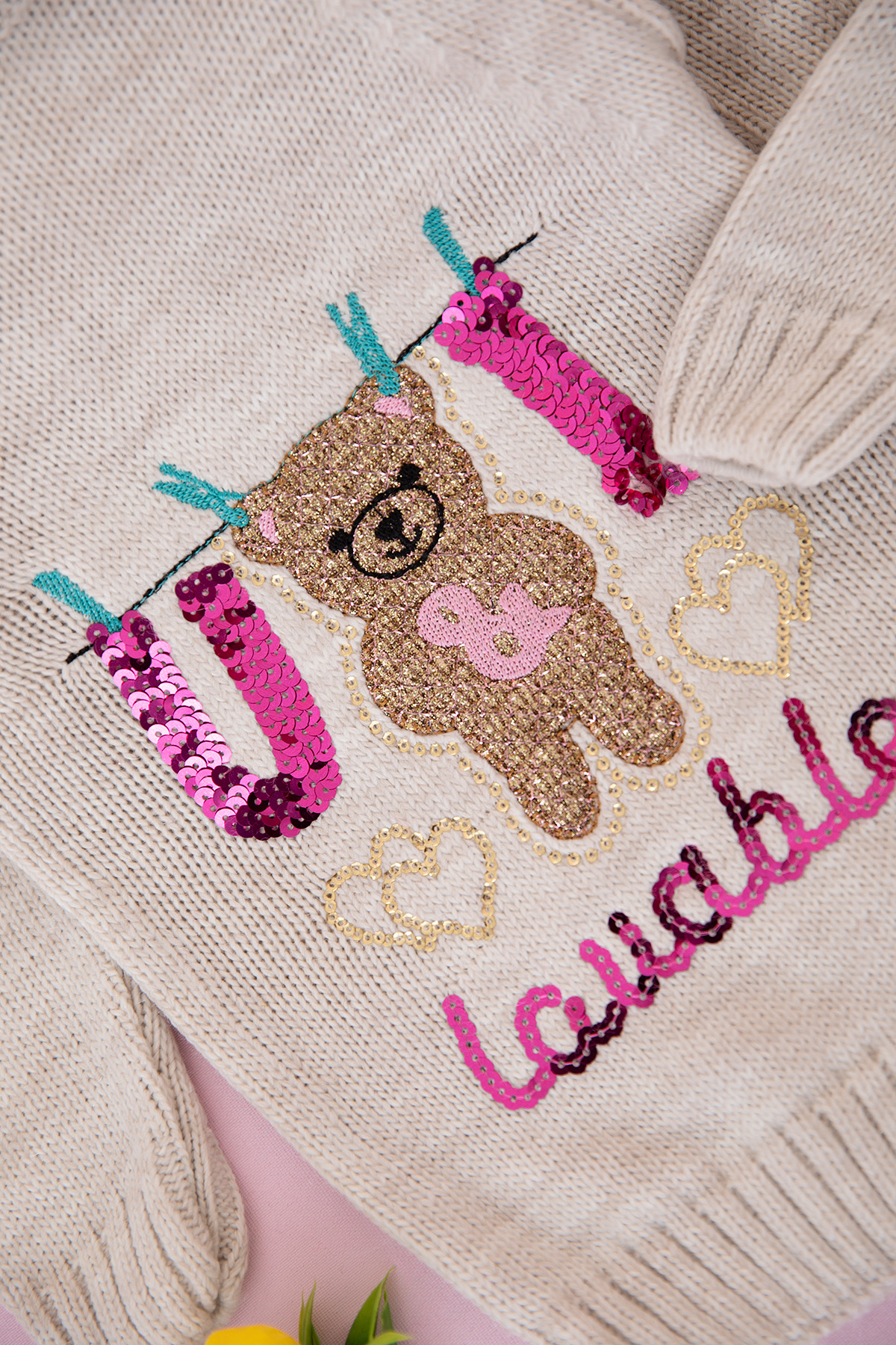 Kız Çocuk Pullu Ayı Nakışlı Kazak (0-3 Yaş)