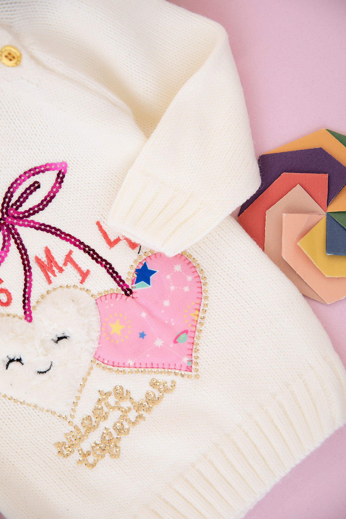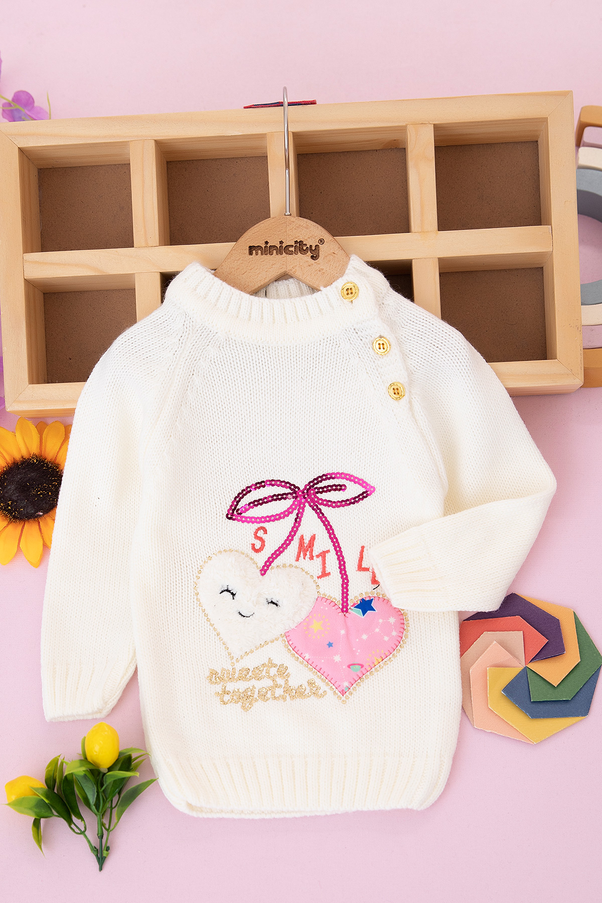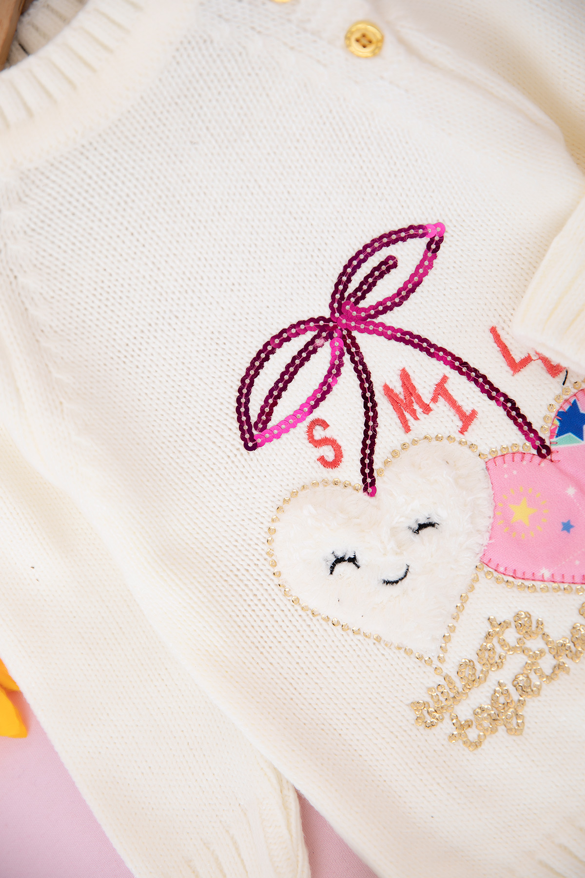 Kız Çocuk Pullu Smile Kalp Nakışlı Kazak (0-3 Yaş)