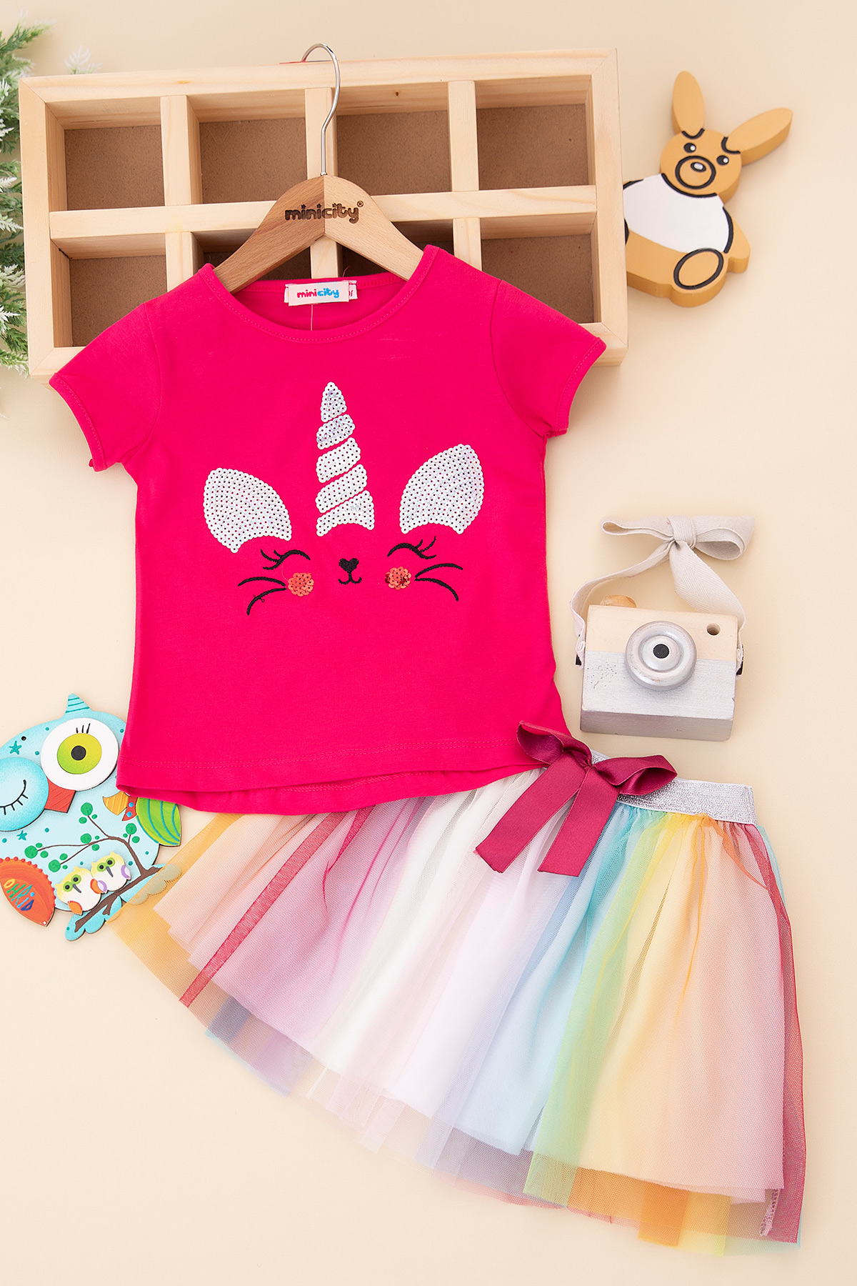 Kız Çocuk Pullu Unicorn Etekli Takım - 123529 (3-7 Yaş)