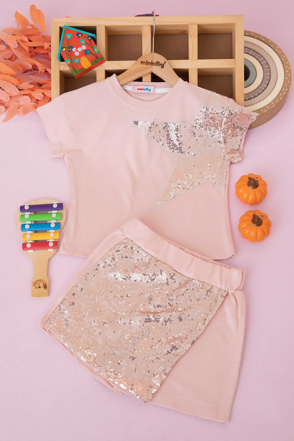 Kız Çocuk Pullu Yıldızlı Şort Etekli Takım - 2070 (4-10 Yaş)