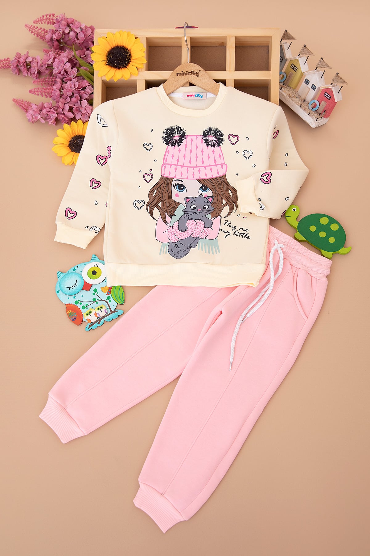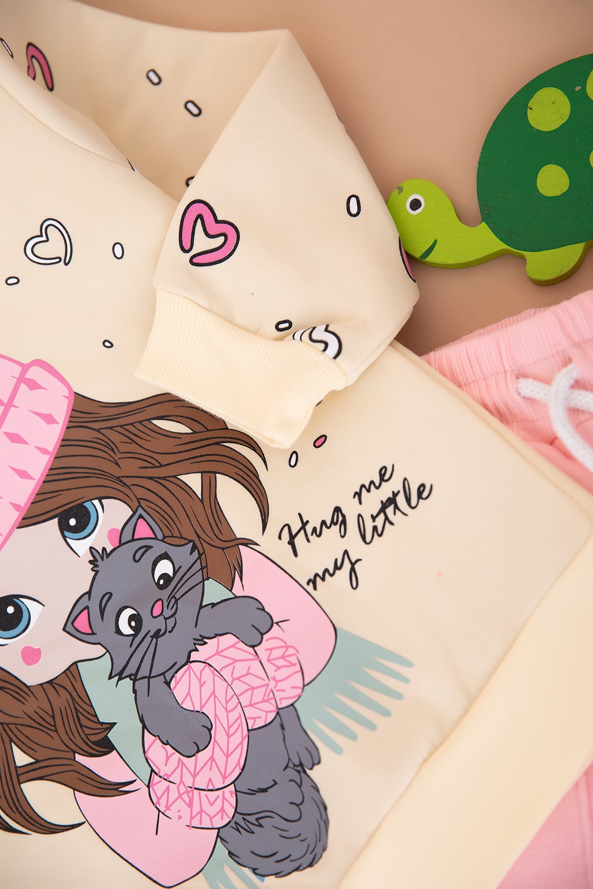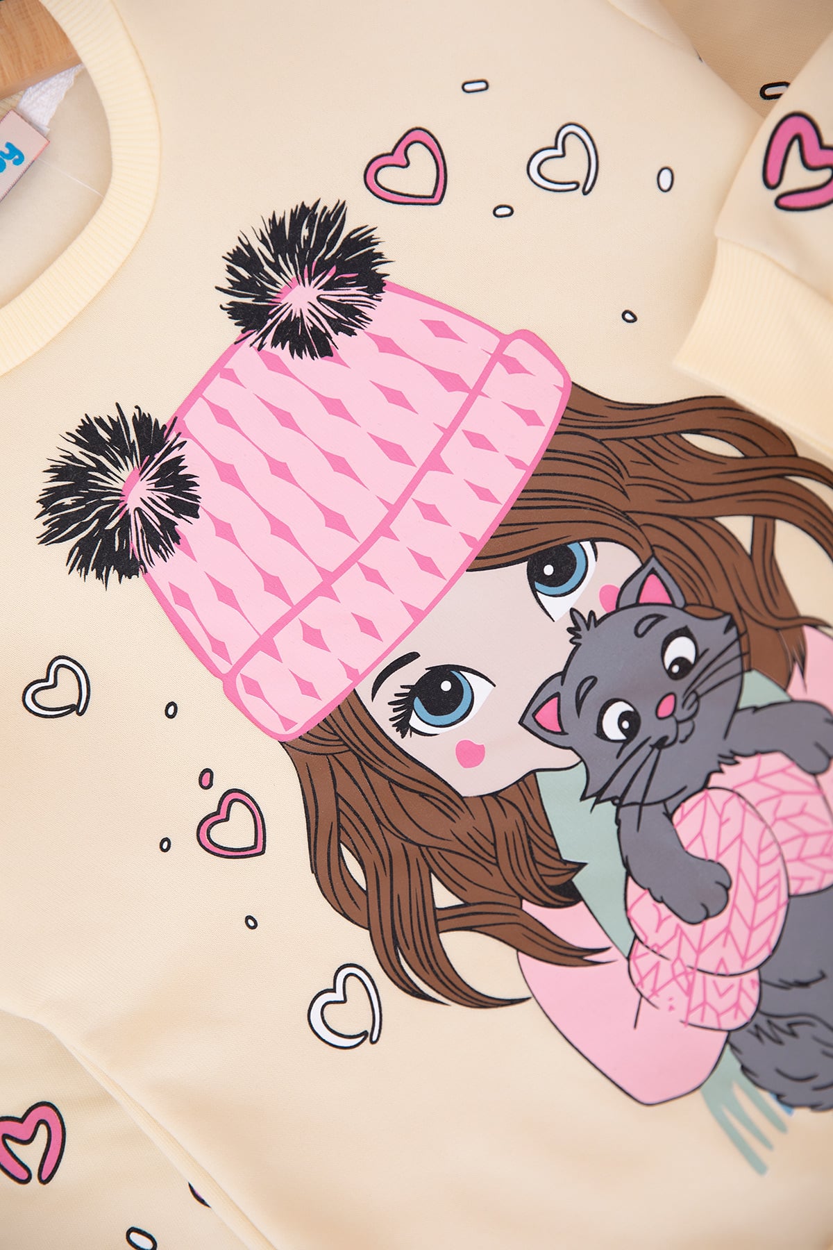 Kız Çocuk Şapkalı Kız Kedi Baskılı Üçip Takım (3-10 Yaş)