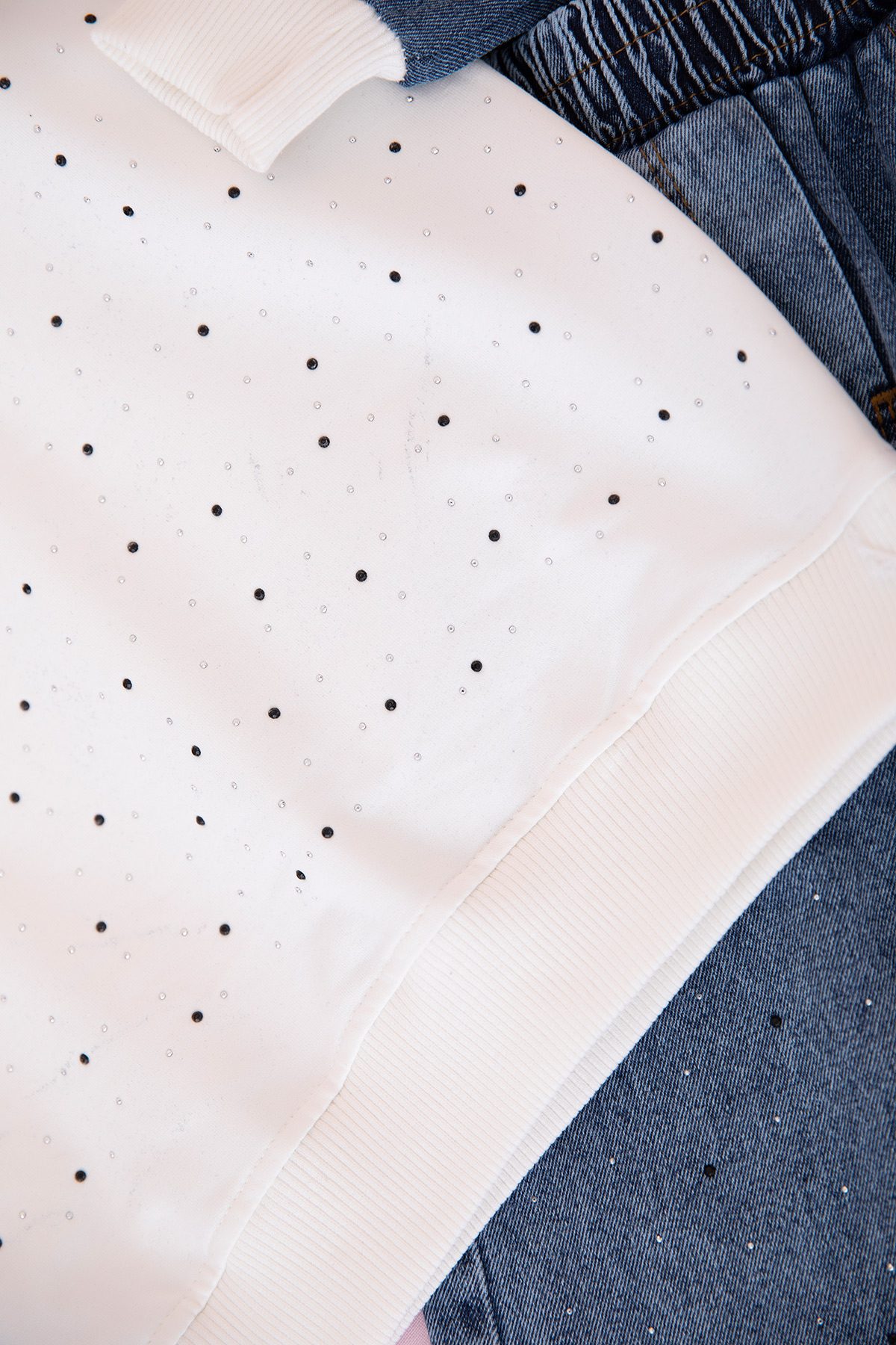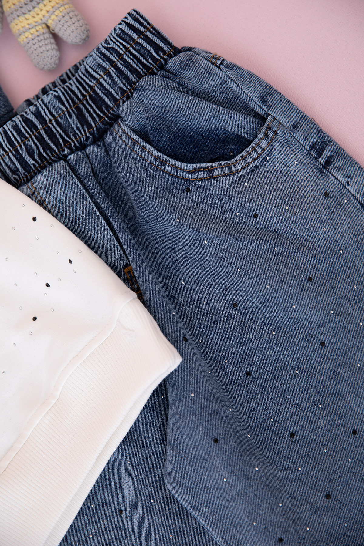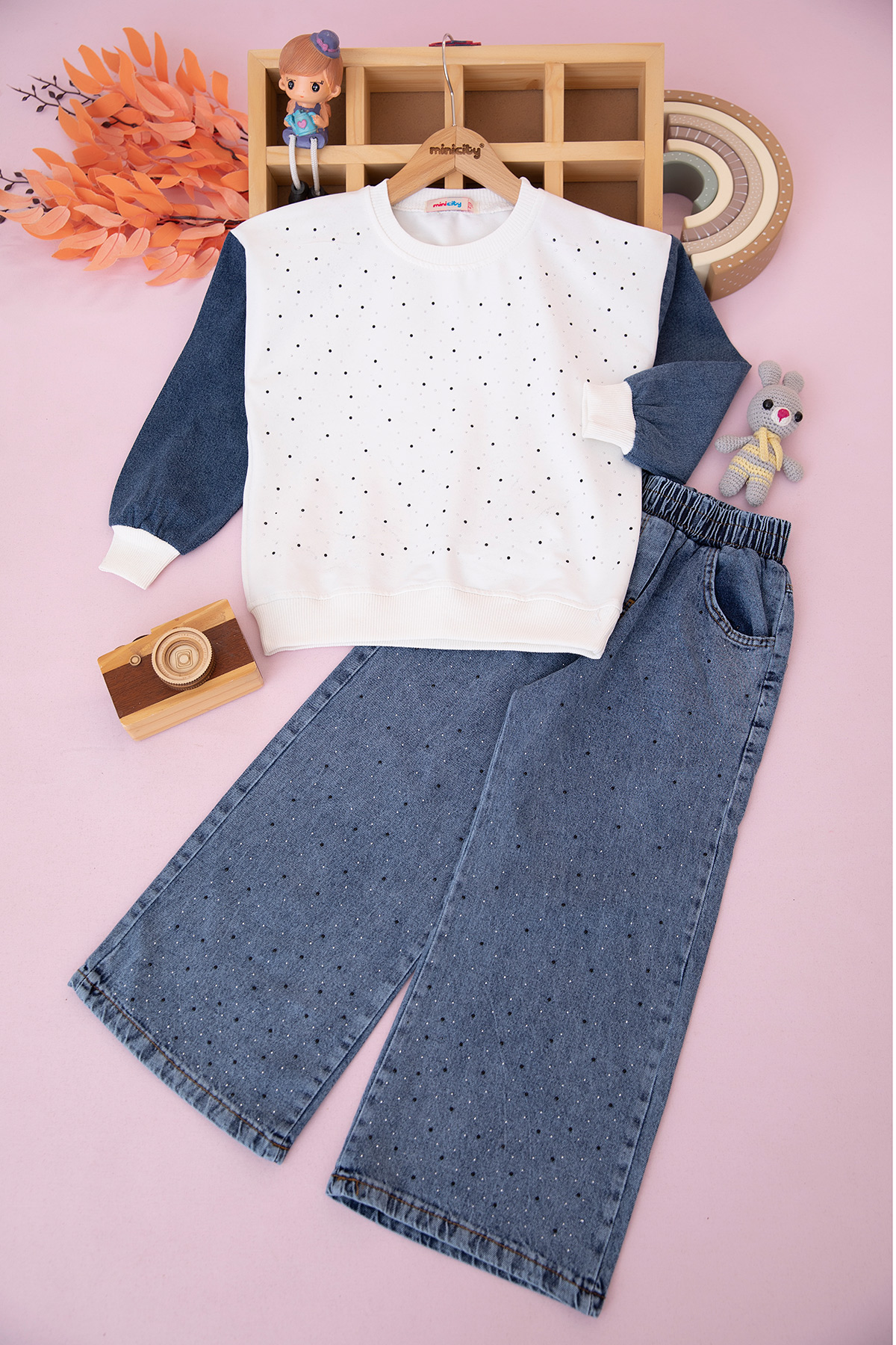 Kız Çocuk Serpme Taşlı Kot Pantolon Takım - 2688 (6-10 Yaş)