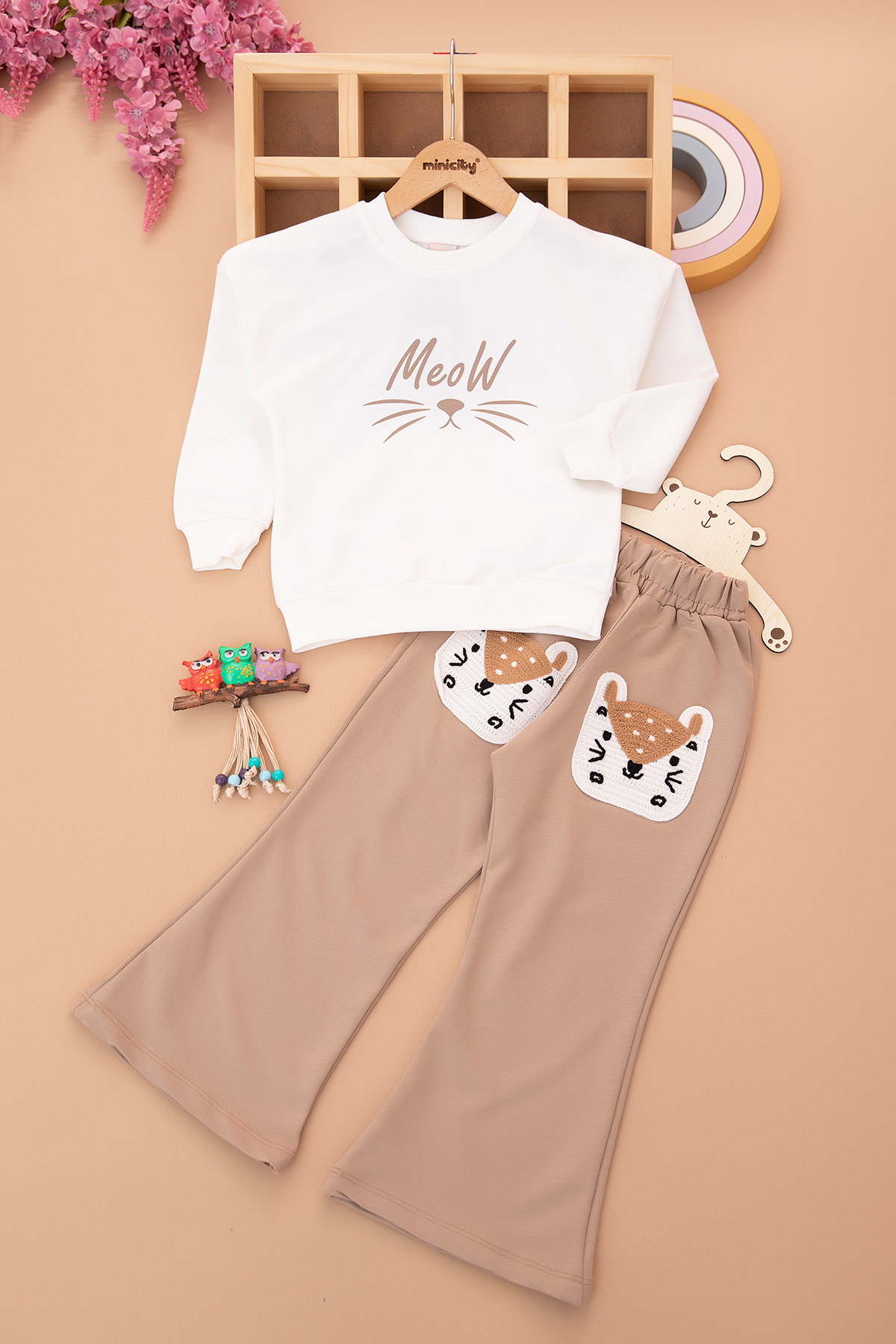 Kız Çocuk Süzene Kedi Nakışlı Cepli Takım - 11611 (5-9 Yaş)