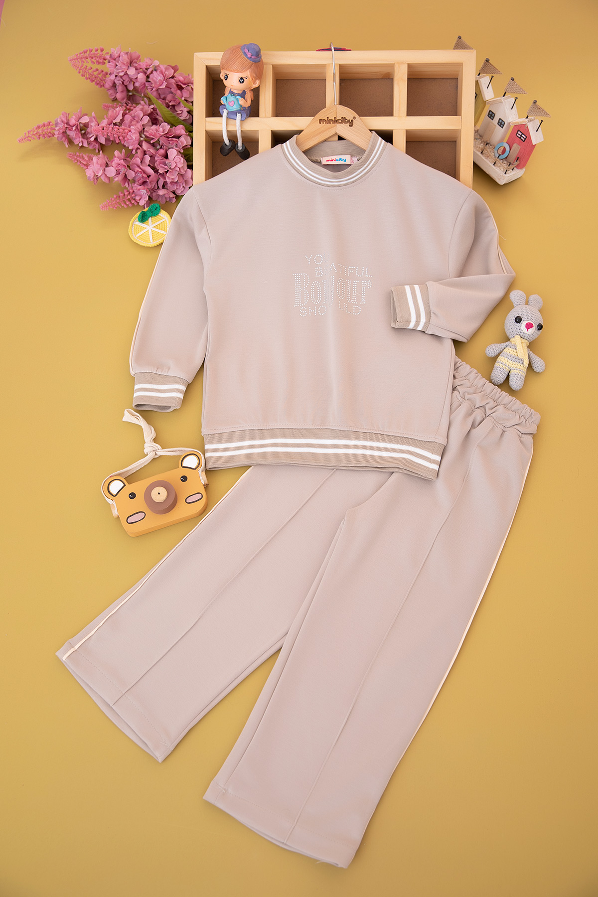 Kız Çocuk Taşlı Bonjour Nakışlı Takım - 70715 (5-12 Yaş)