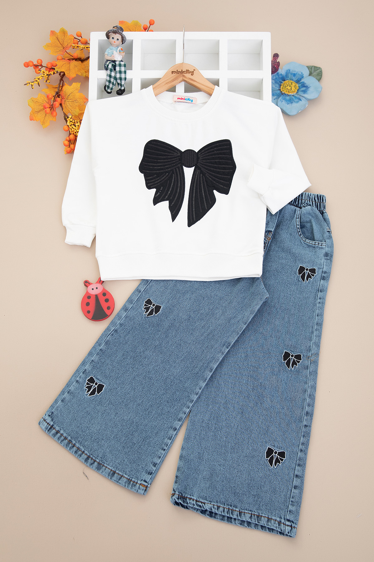Kız Çocuk Taşlı Büyük Fiyonklu Pantolon Takım - 2664 (6-10 Yaş)