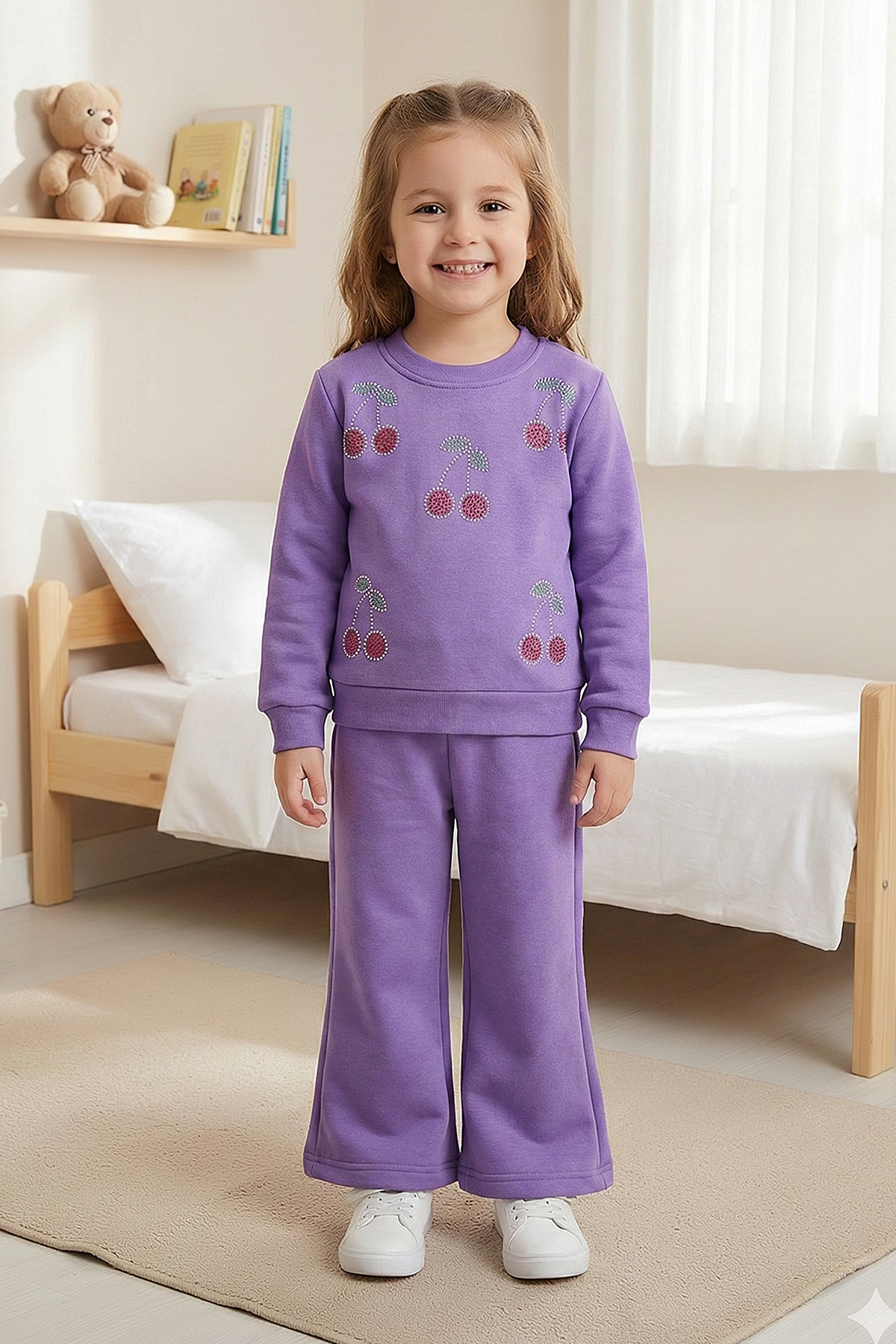 Kız Çocuk Taşlı Kiraz Nakışlıı Üçip Takım (3-10 Yaş)