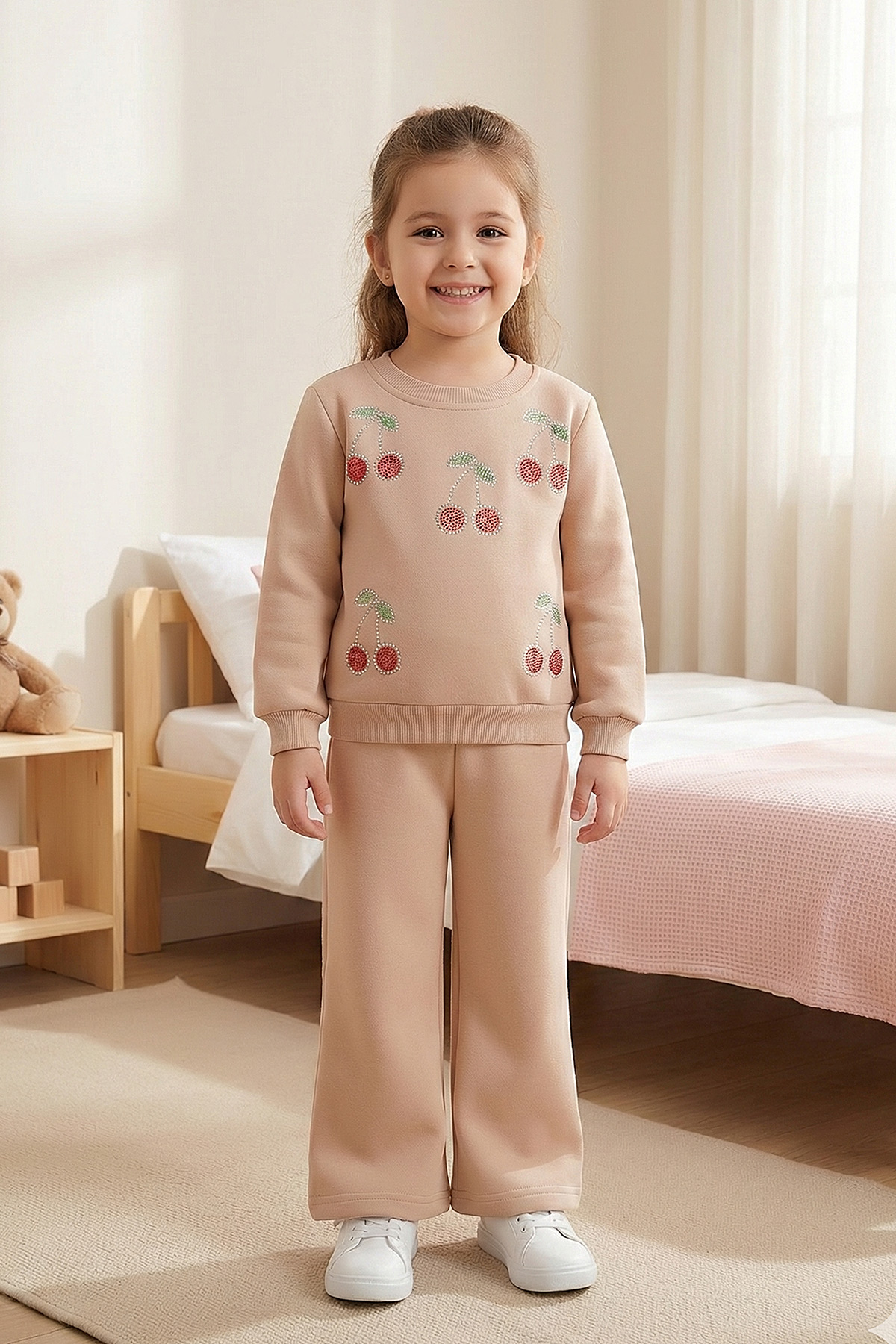 Kız Çocuk Taşlı Kiraz Nakışlıı Üçip Takım (3-10 Yaş)