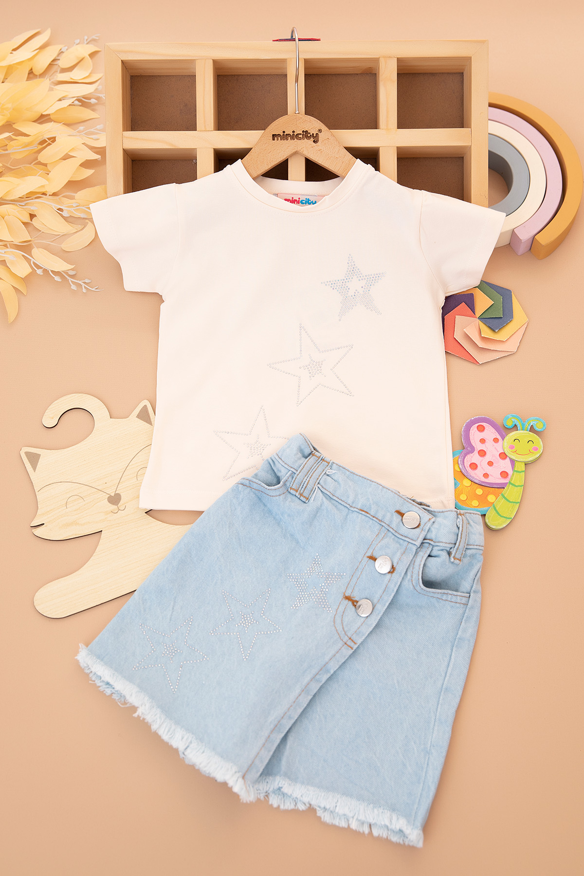 Kız Çocuk Taşlı Yıldız Kot Etekli Takım - H-1045 (3-10 Yaş)