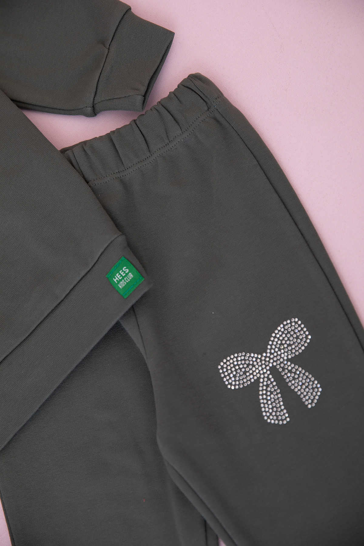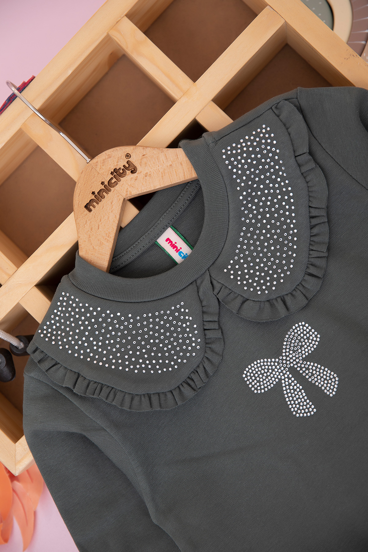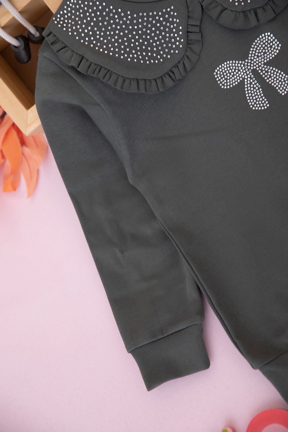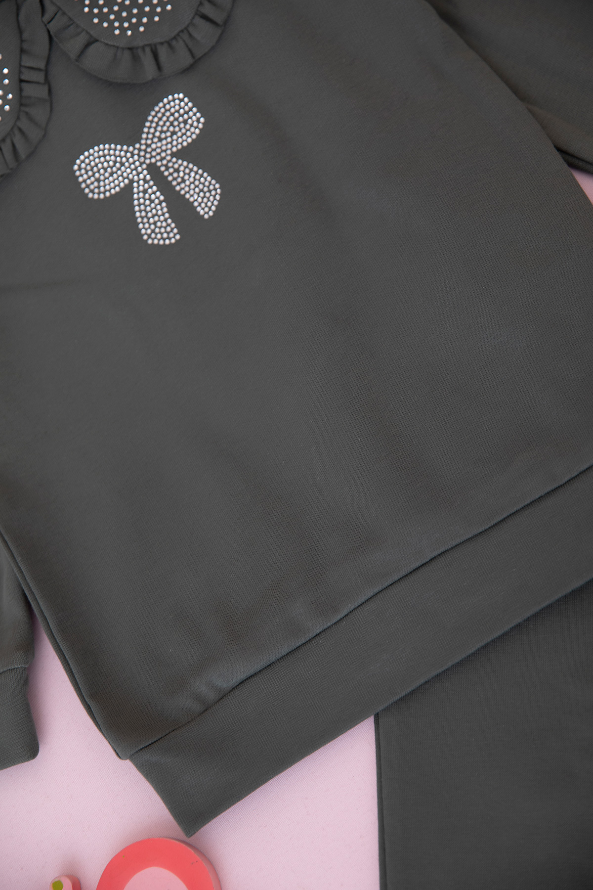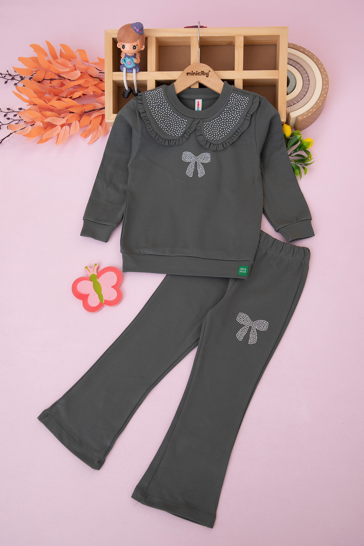 Kız Çocuk Yaka Fırfırlı Taşlı Fiyonklu Takım (3-10 Yaş)
