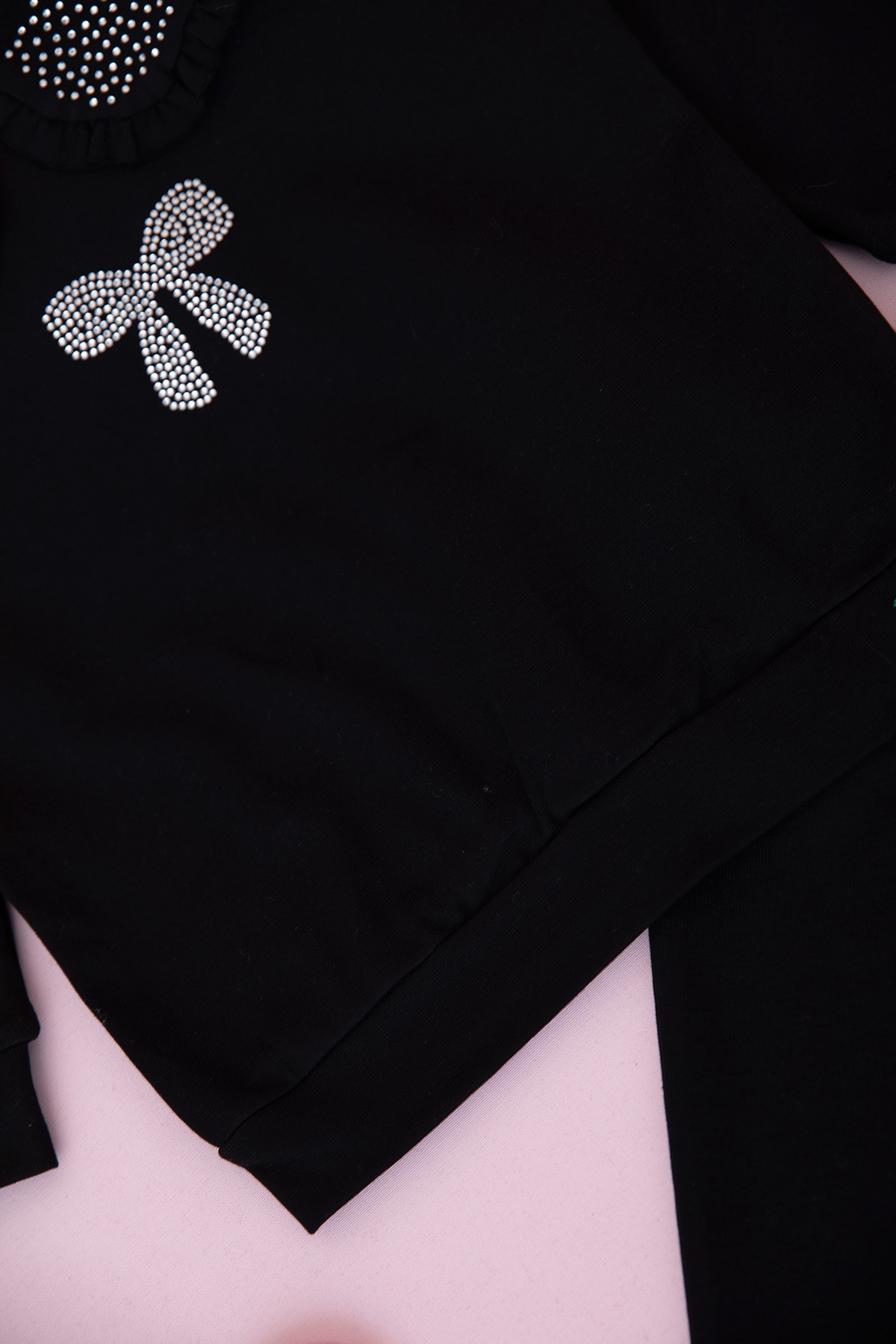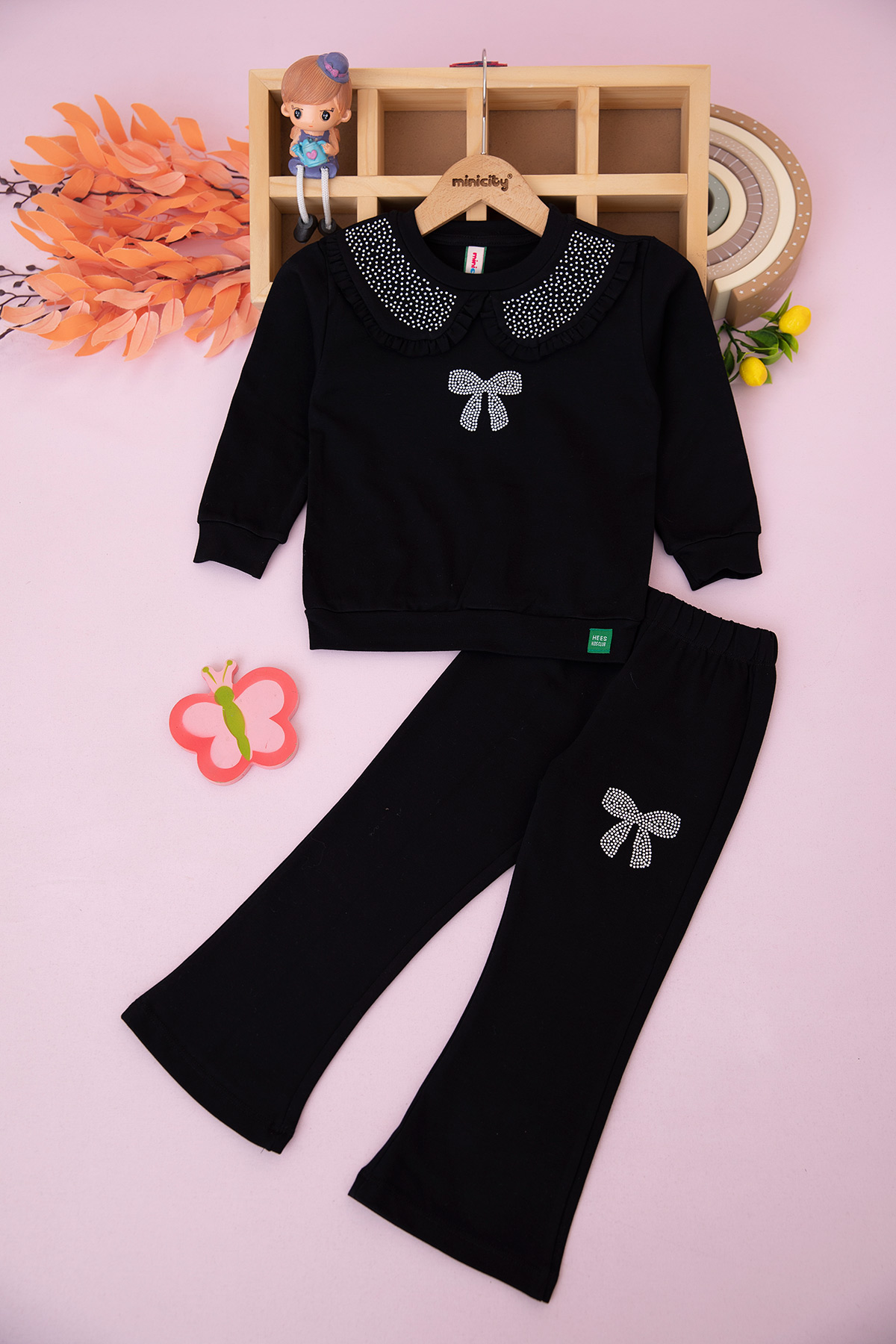 Kız Çocuk Yaka Fırfırlı Taşlı Fiyonklu Takım (3-10 Yaş)
