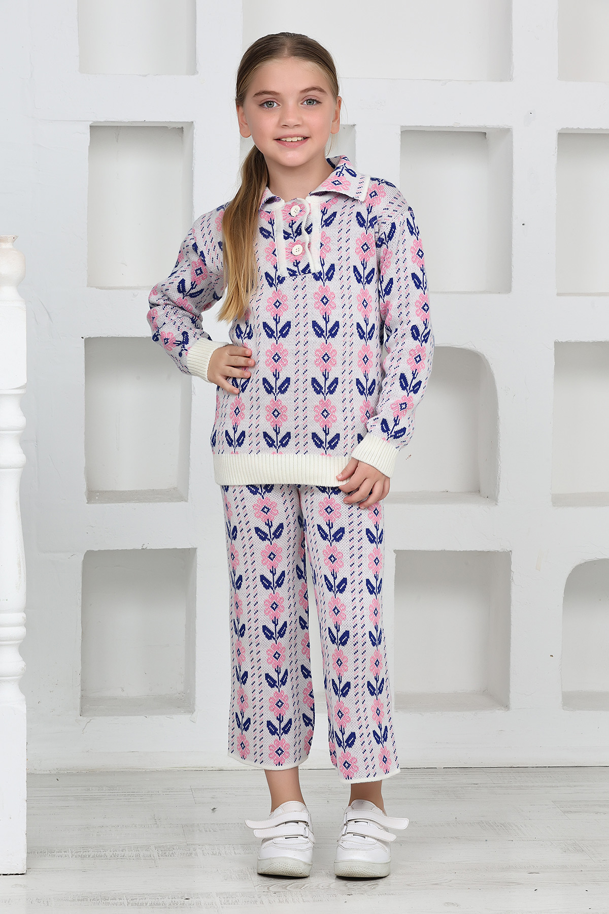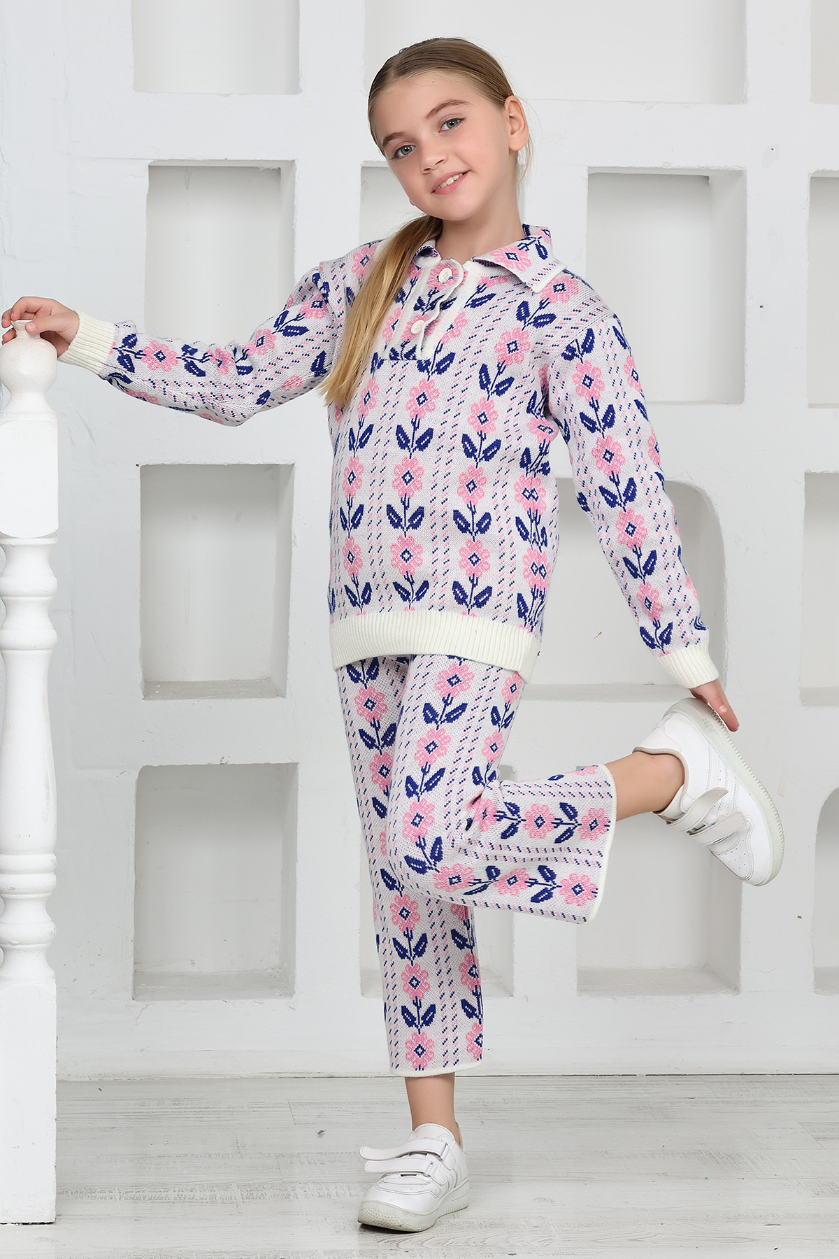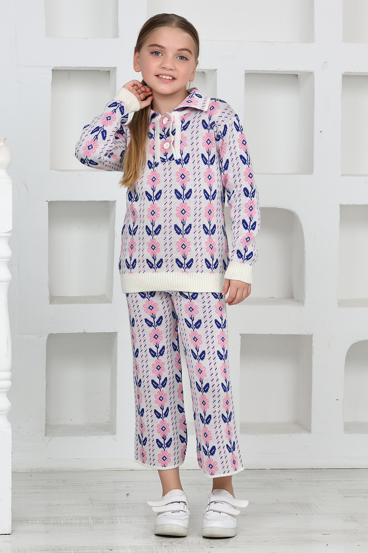 Kız Çocuk Yakalı Düğmeli Çiçekli Taytlı Takım (3-8 Yaş)