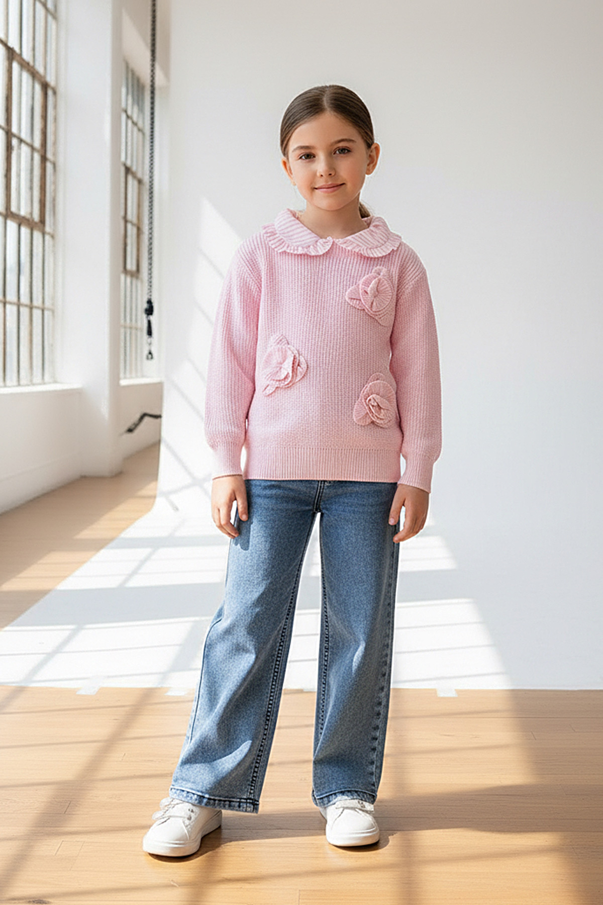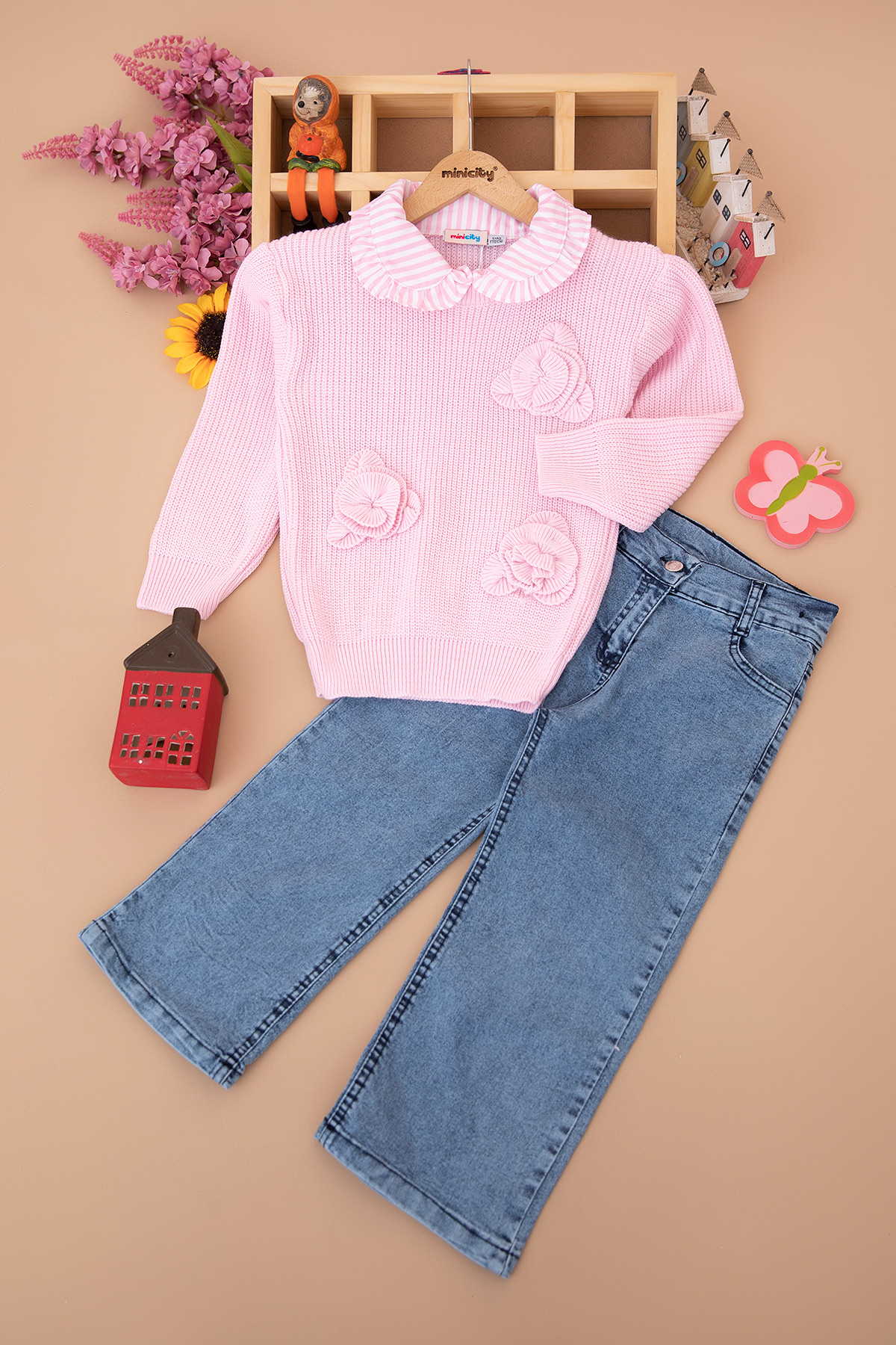 Kız Çocuk Yakası Çizgili Güllü Takım - (5-8 Yaş)