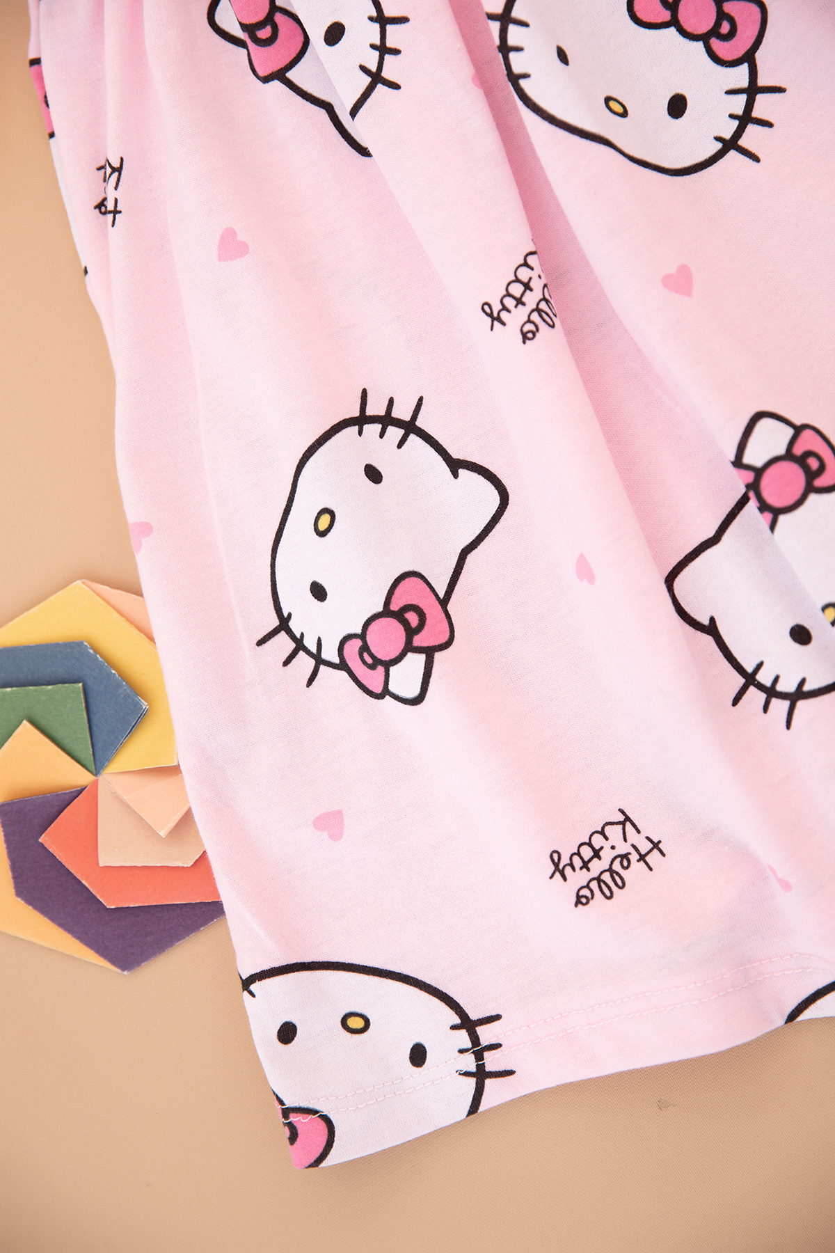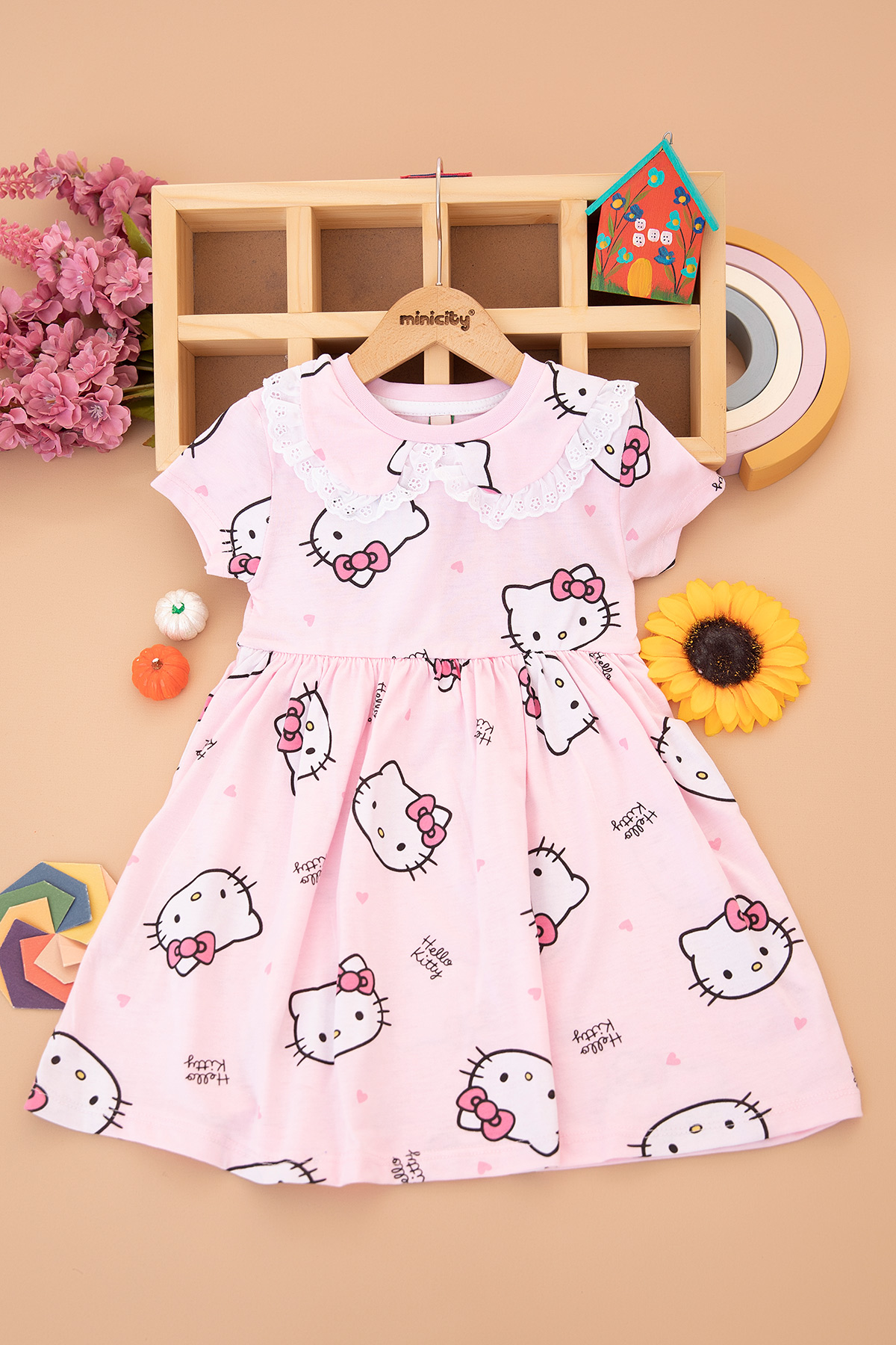 Kız Çocuk Yakası Fistolu Baskılı Penye Elbise (3-8 Yaş)