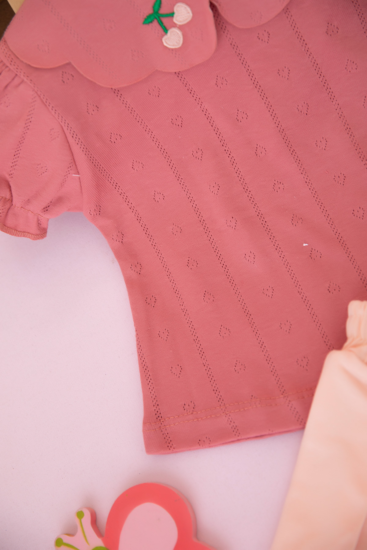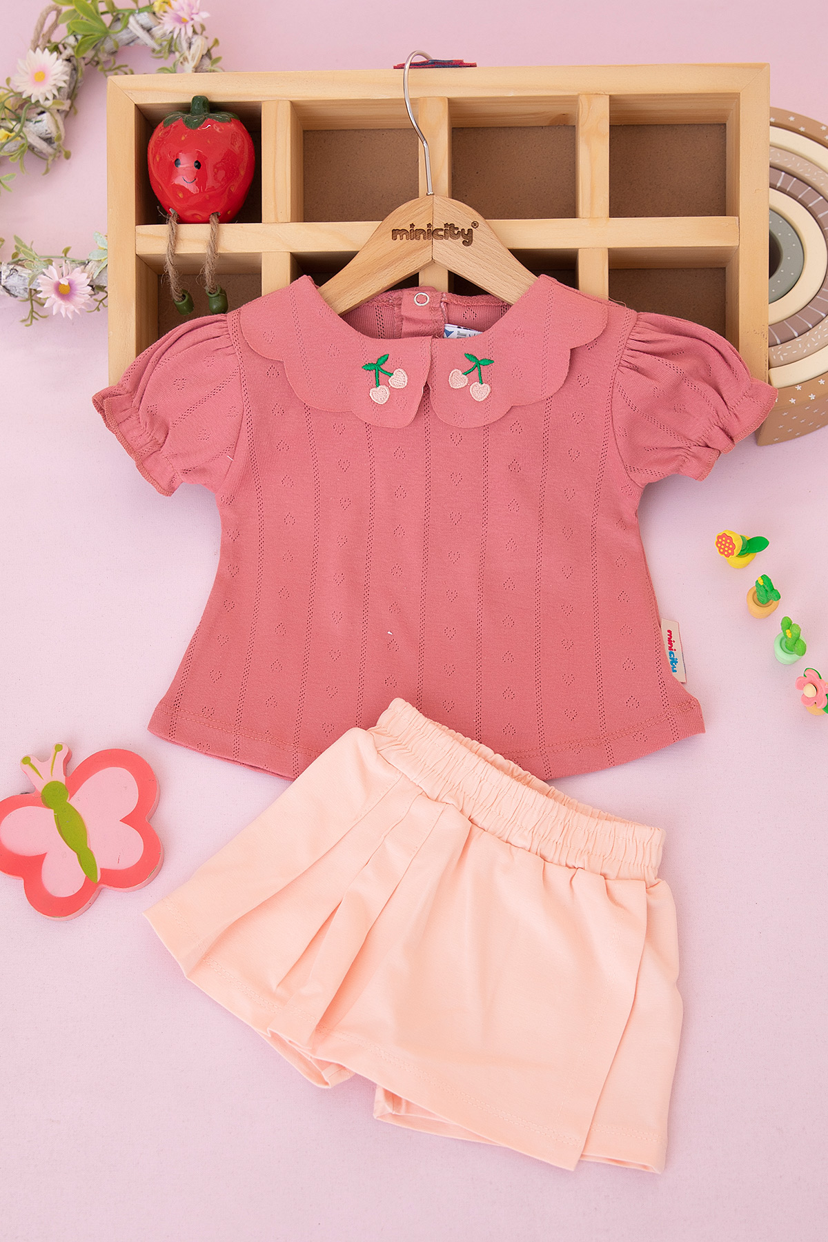 Kız Çocuk Yakası Kiraz Nakışlı Şort Etek Takım - 26565 (3-6 Yaş)