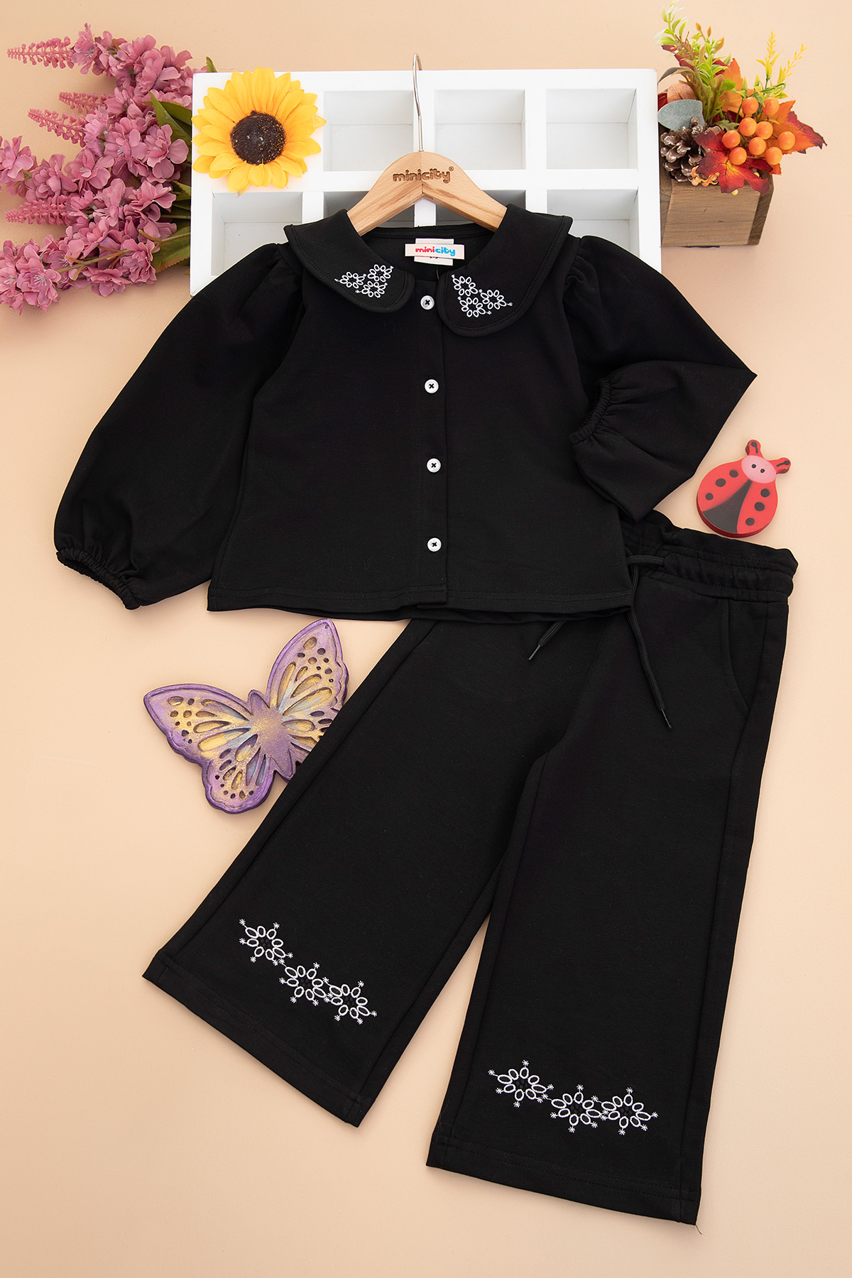 Kız Çocuk Yakası Nakışlı Düğmeli Takım - (2 - 8 Yaş)
