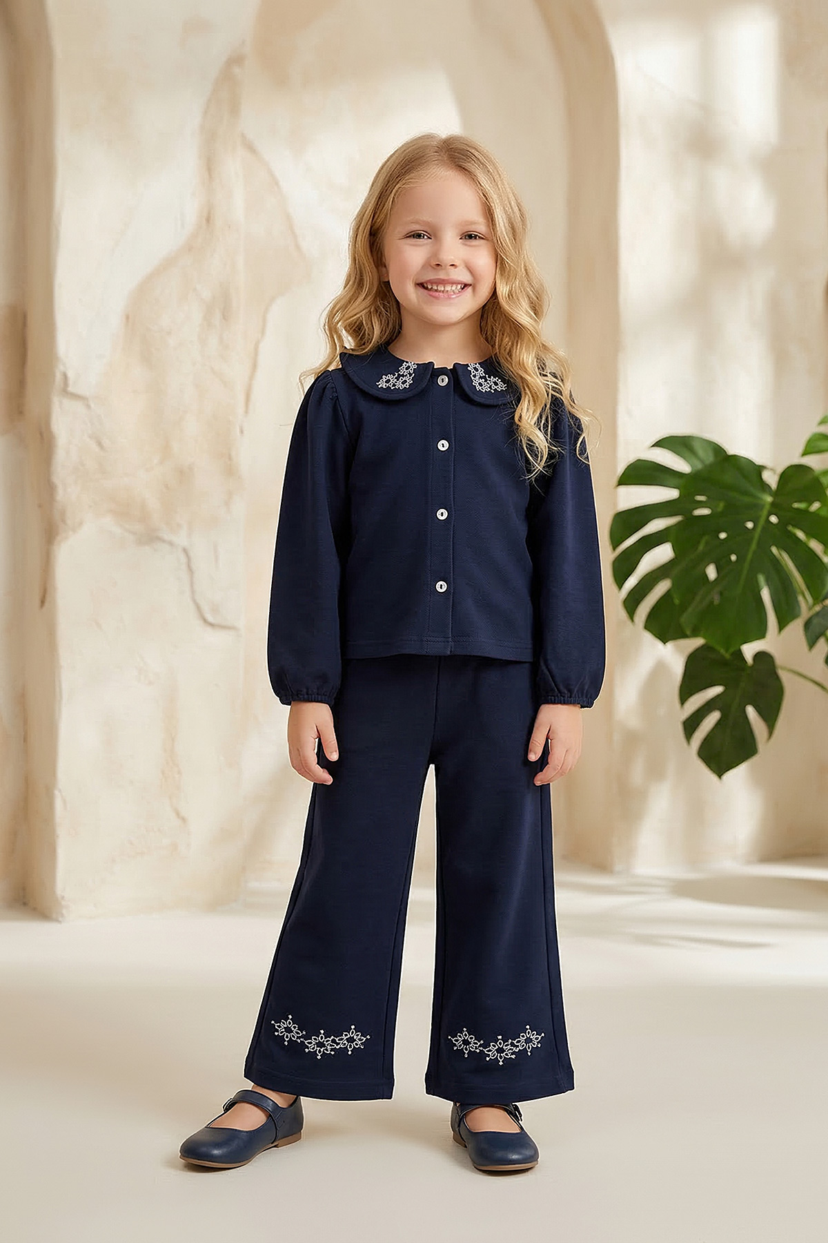 Kız Çocuk Yakası Nakışlı Düğmeli Takım - (2 - 8 Yaş)