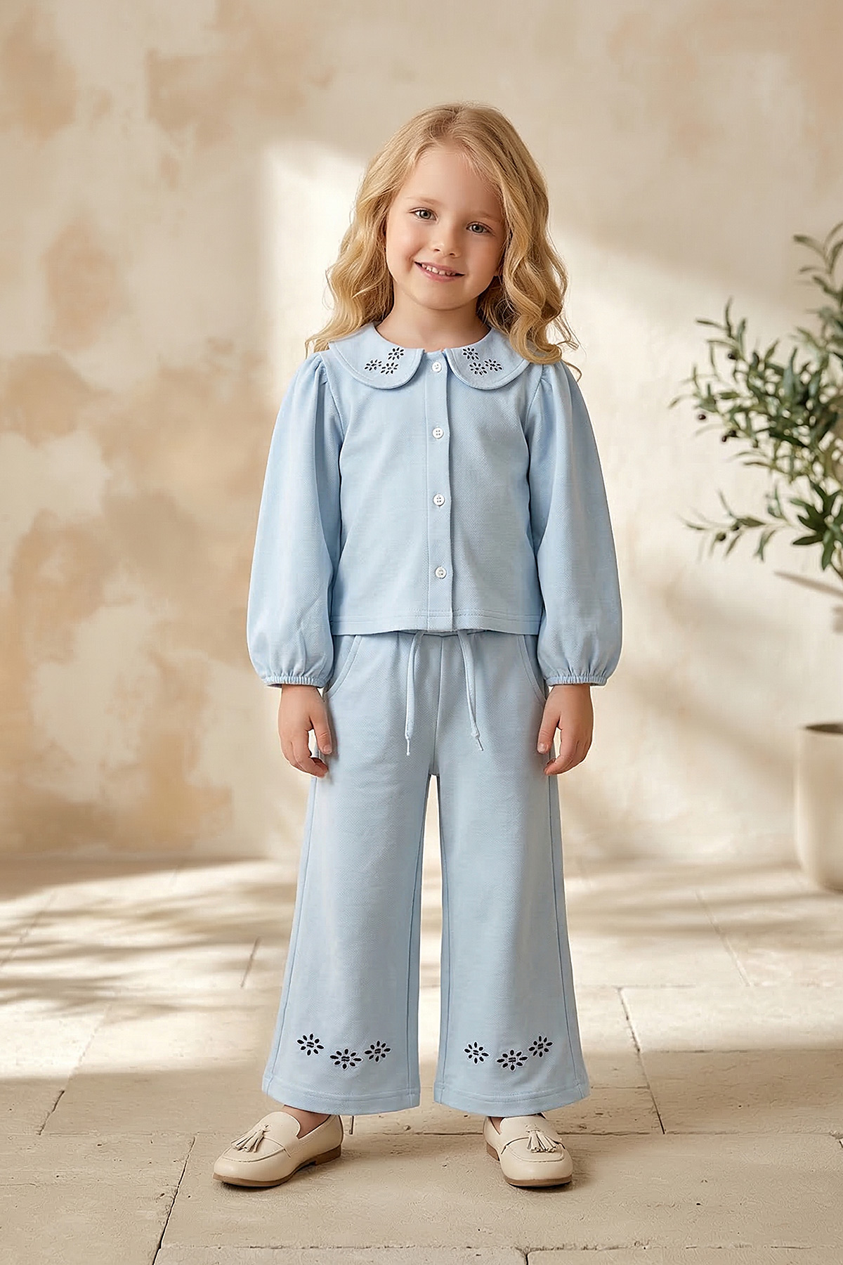 Kız Çocuk Yakası Nakışlı Düğmeli Takım - (2 - 8 Yaş)