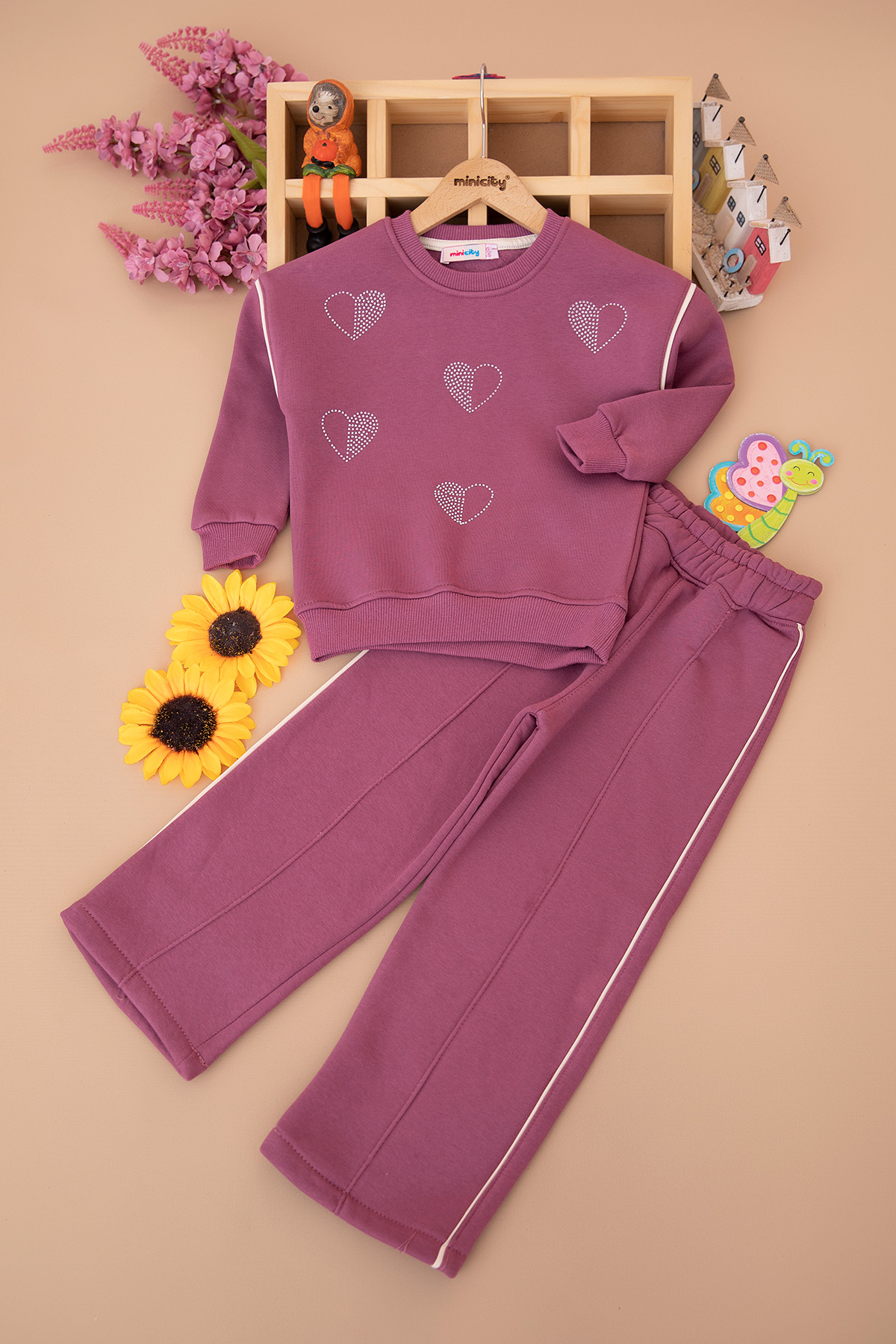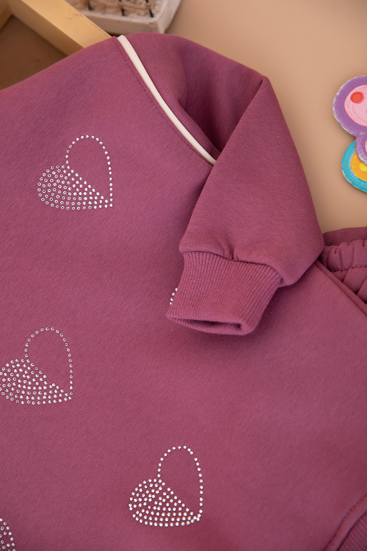 Kız ÇocukTaşlı Kalp Nakışlı Üçip Takım - (5-12 Yaş)
